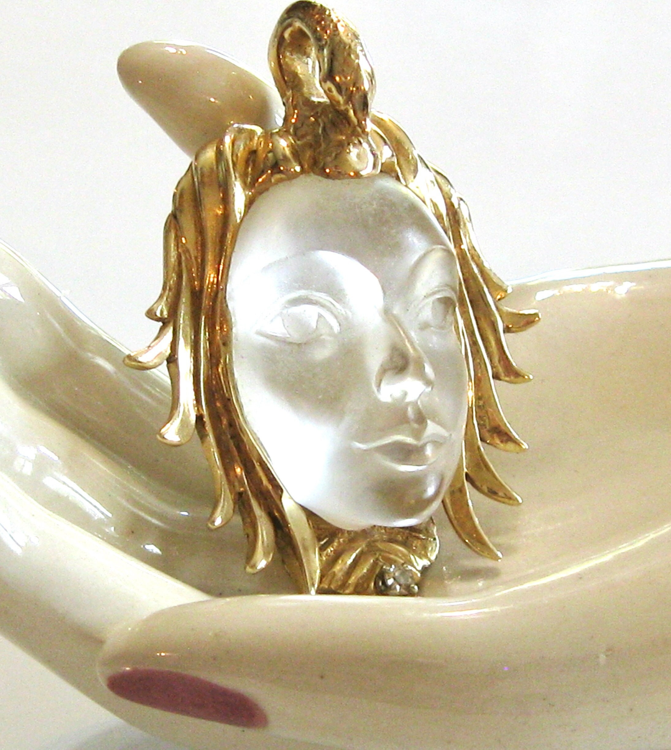 ~ Depicts a carved gemstone or rock crystal female face draped or enveloped by or centered in a swans body