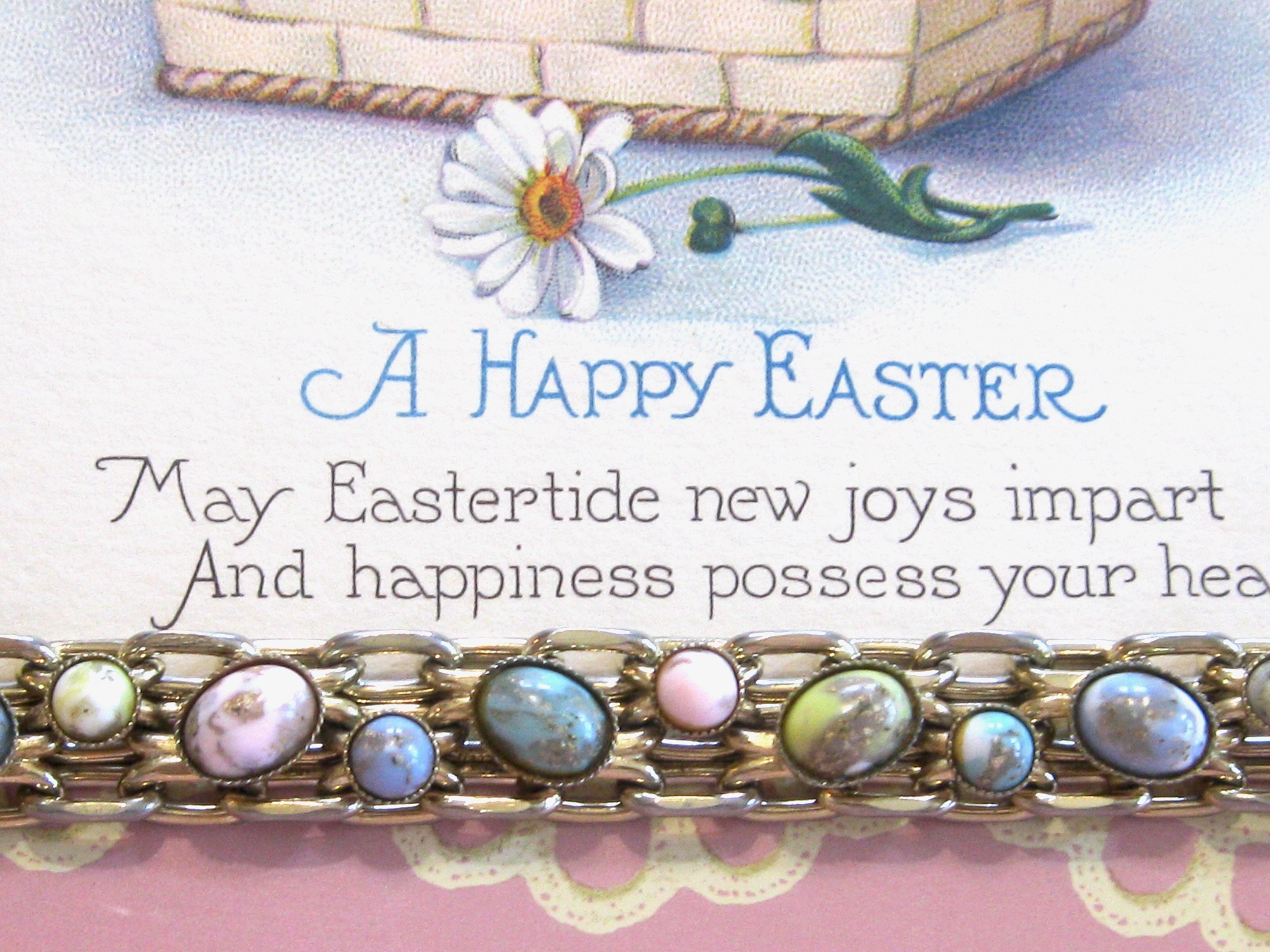 Vintage gold toned bracelet with pastel Easter Egg art glass rhinestones: