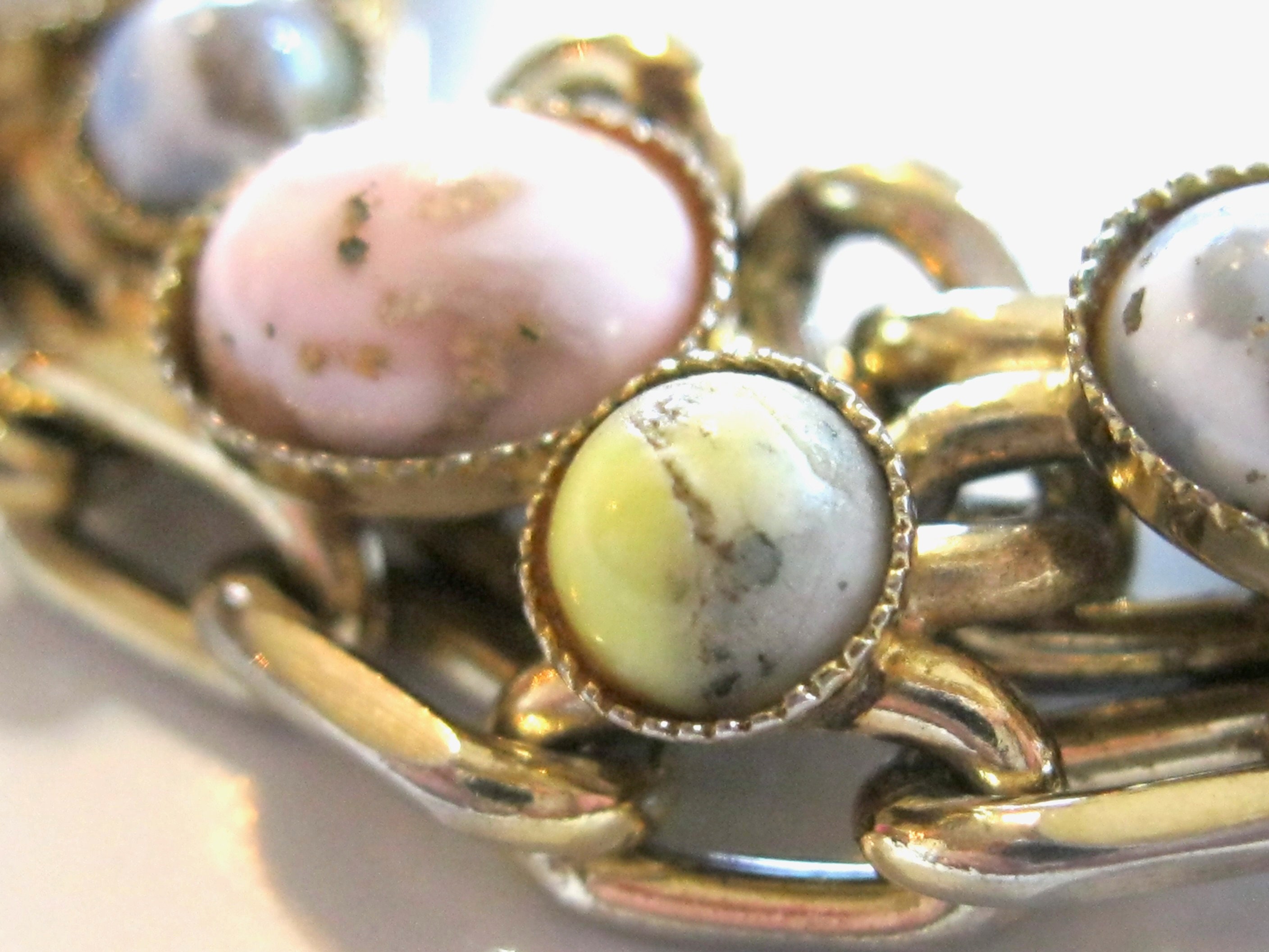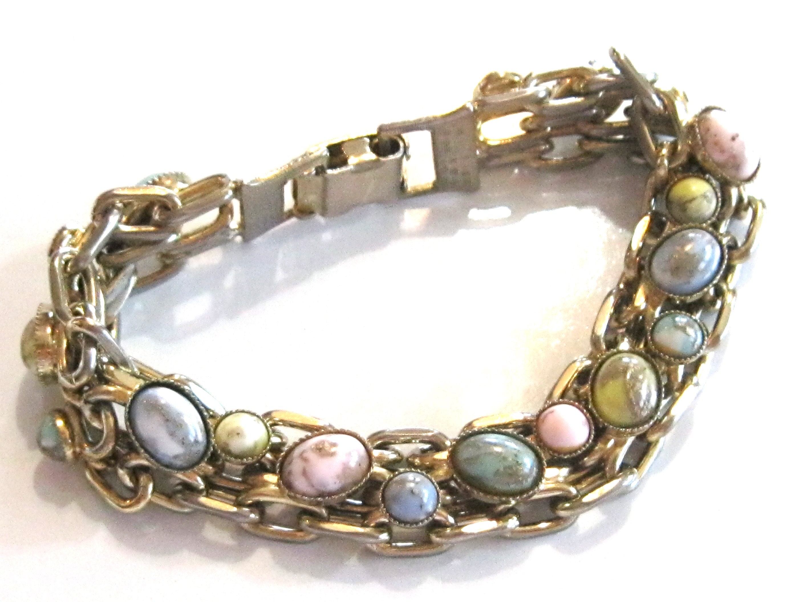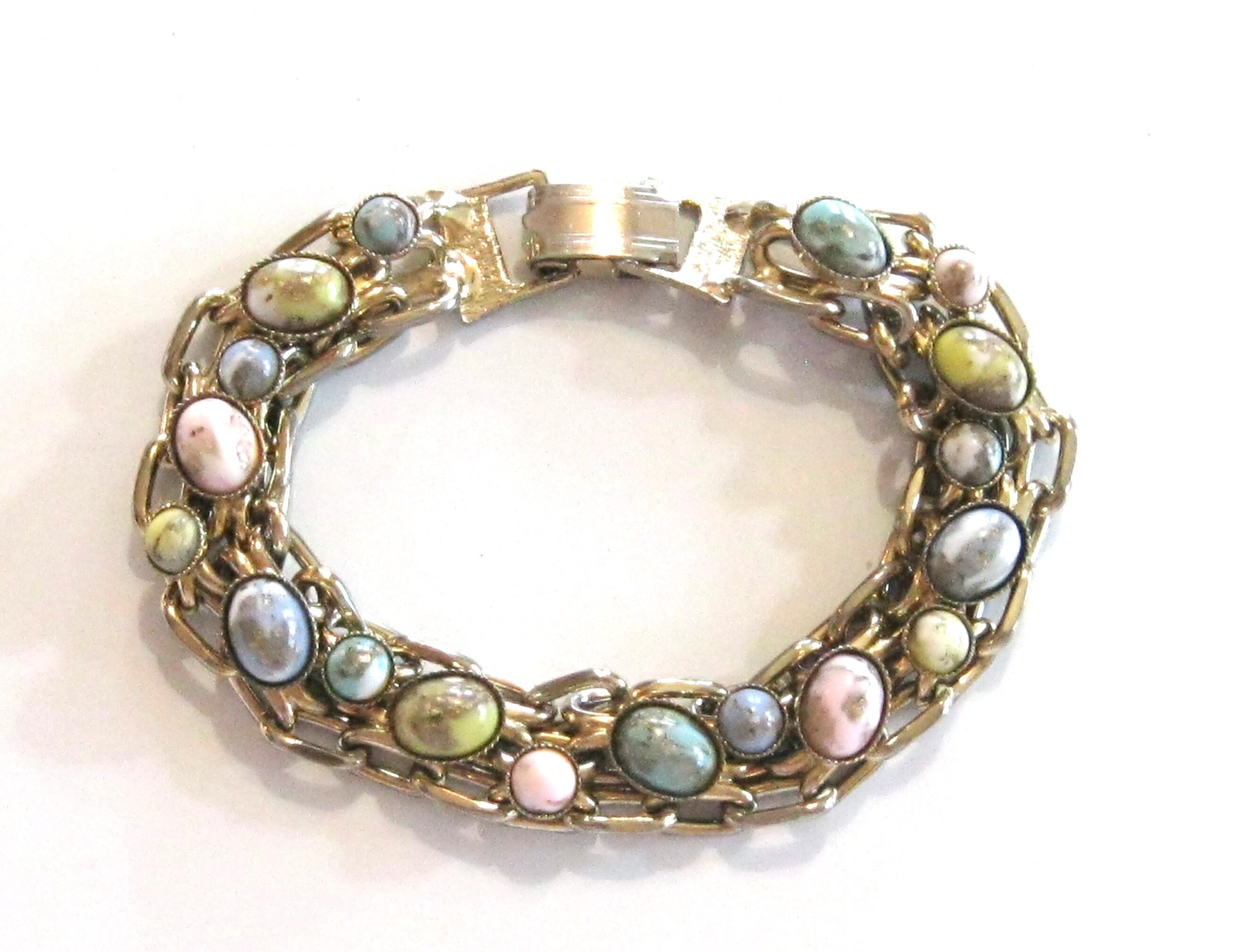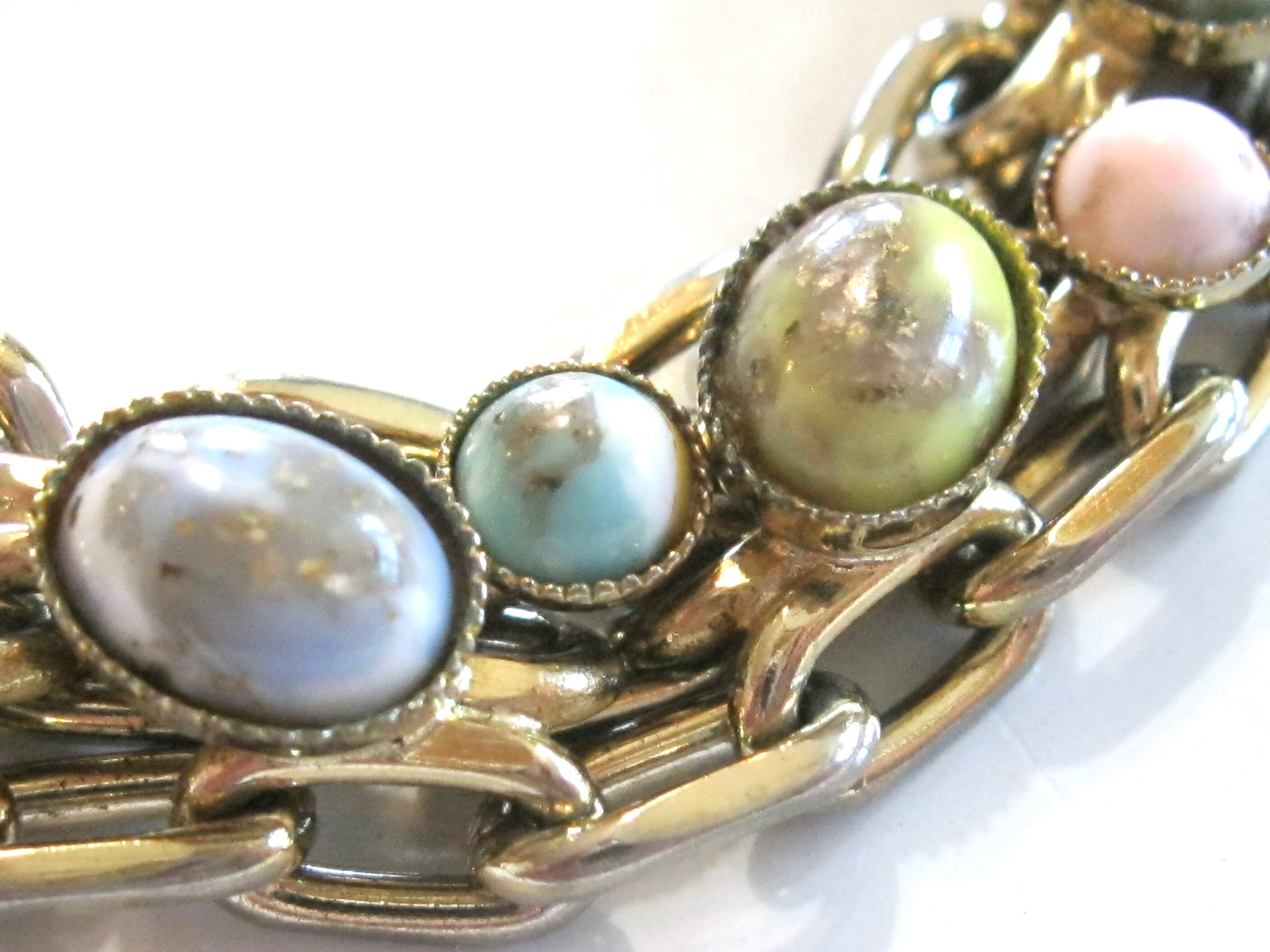 CONDITION: Great vintage condition - no damage to mention. One of the light green smaller round stones has a slightly rougher appearance and a stable fissure type mold mark inclusion - original to the construction of the bracelet / creation of the stone and not damage at all. Just mentioned for accuracy - see last pic. Please study all photos to self-form an opinion of condition and gain additional item insight that only viewing photos can provide. A fantastic find in an excellent state of preservation.