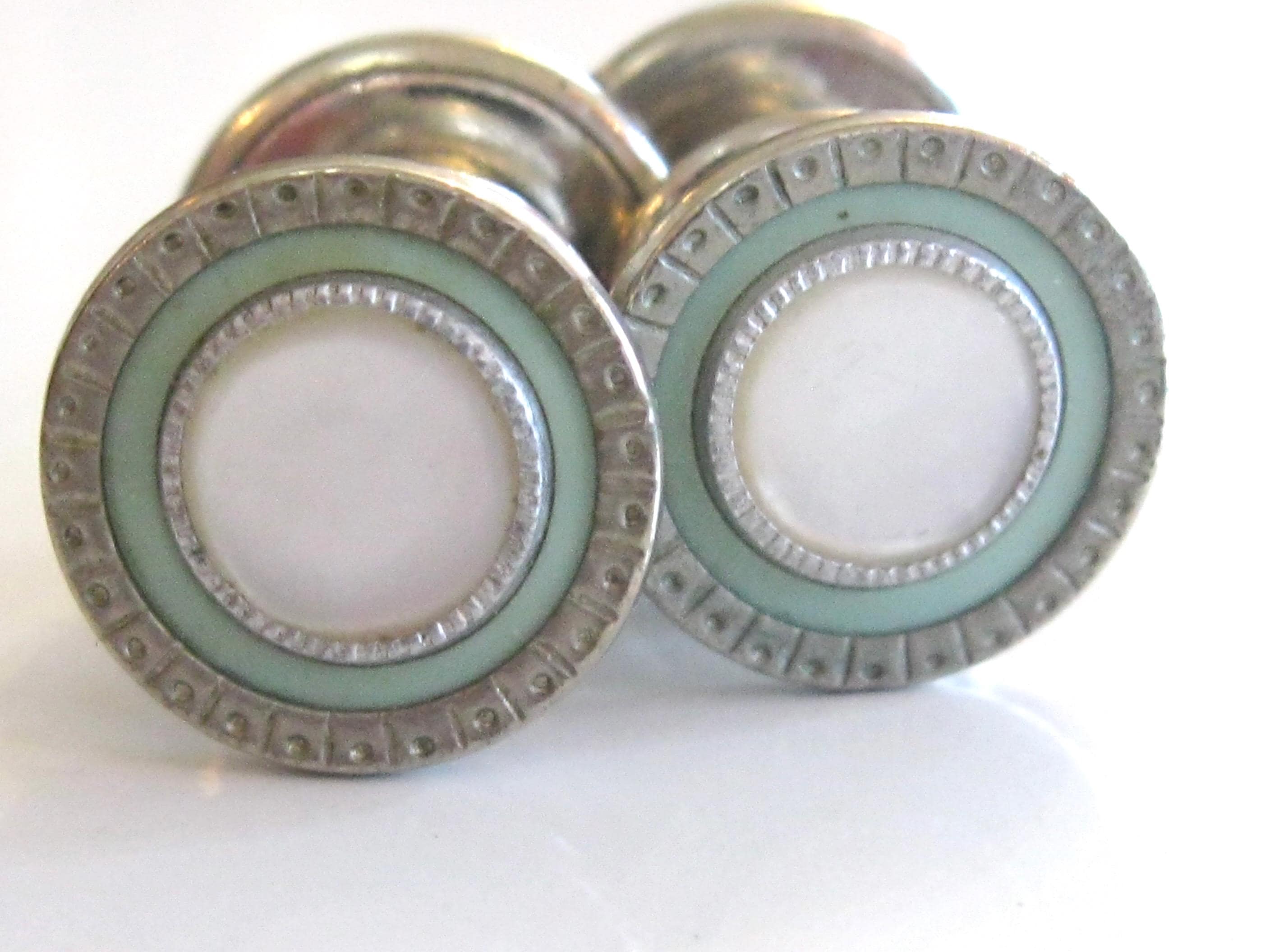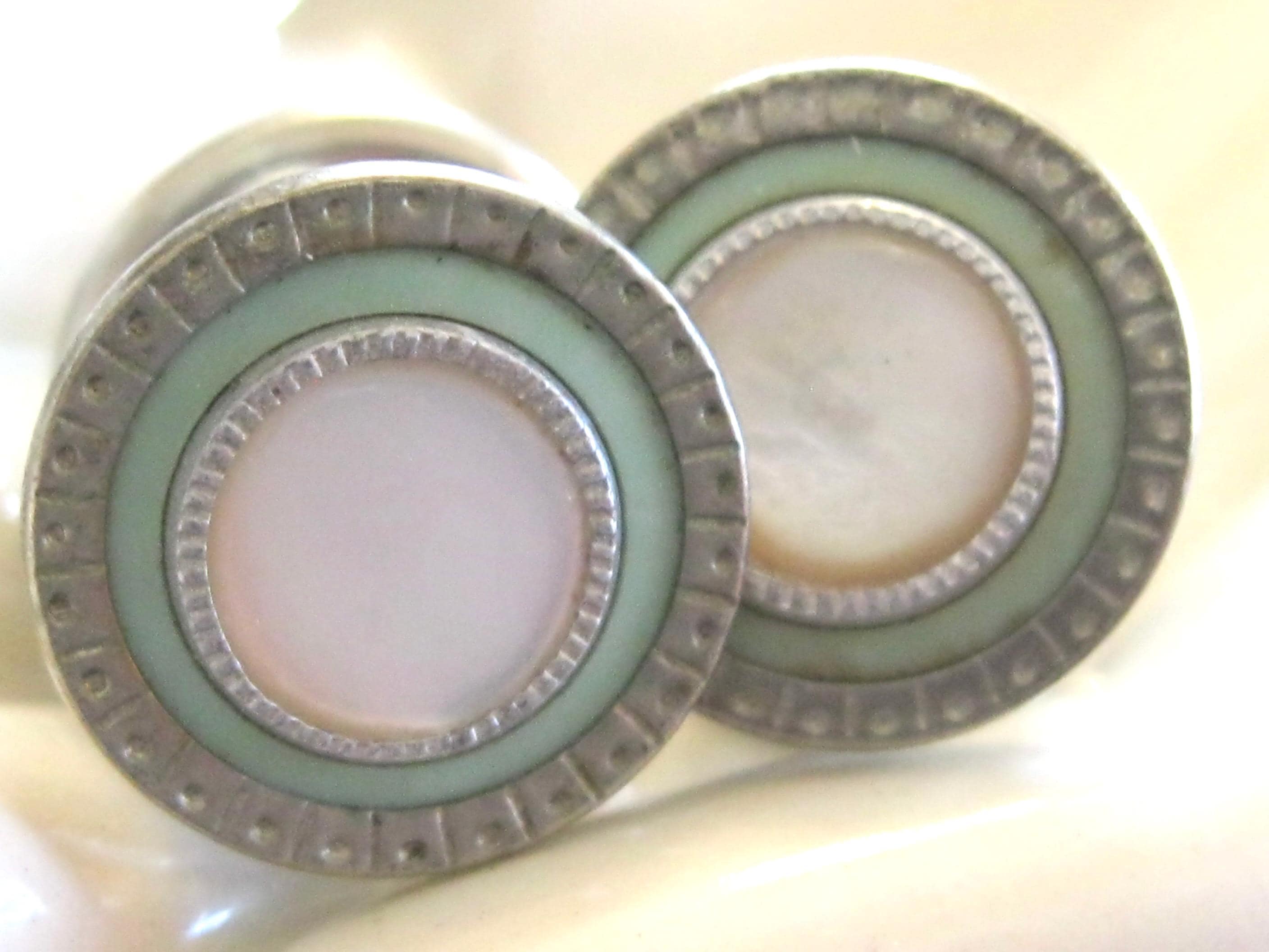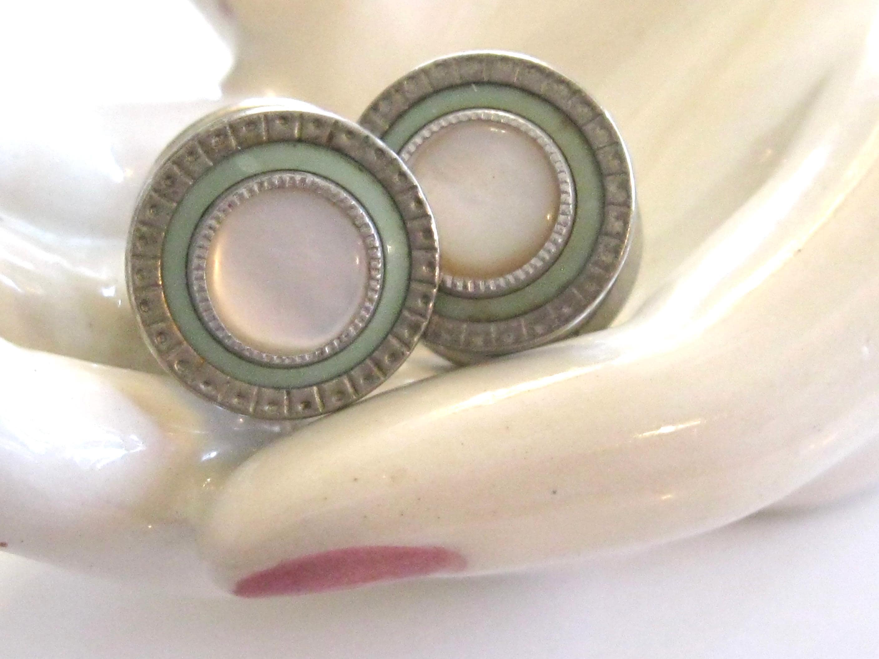 ~ This pair or set features a round shape with light dusty mint or aqua green celluloid background and a polished round mother of pearl shell center