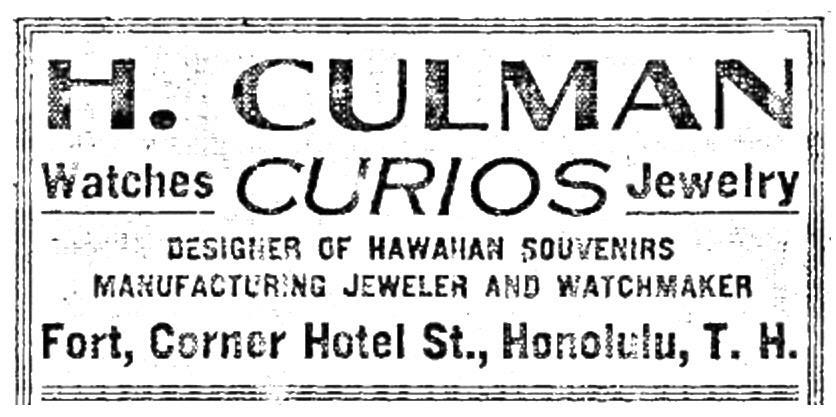MISC INFORMATION: HC is the mark of Harry Culman - who was a world renowned jewelry manufacturer in Honolulu in the early 1900's - as early as 1903 to around 1920 (some sources say 1919 and others 1923). He also dabbled in watches, souvenir spoons and other curios - see vintage newspaper ad in the photo line up.