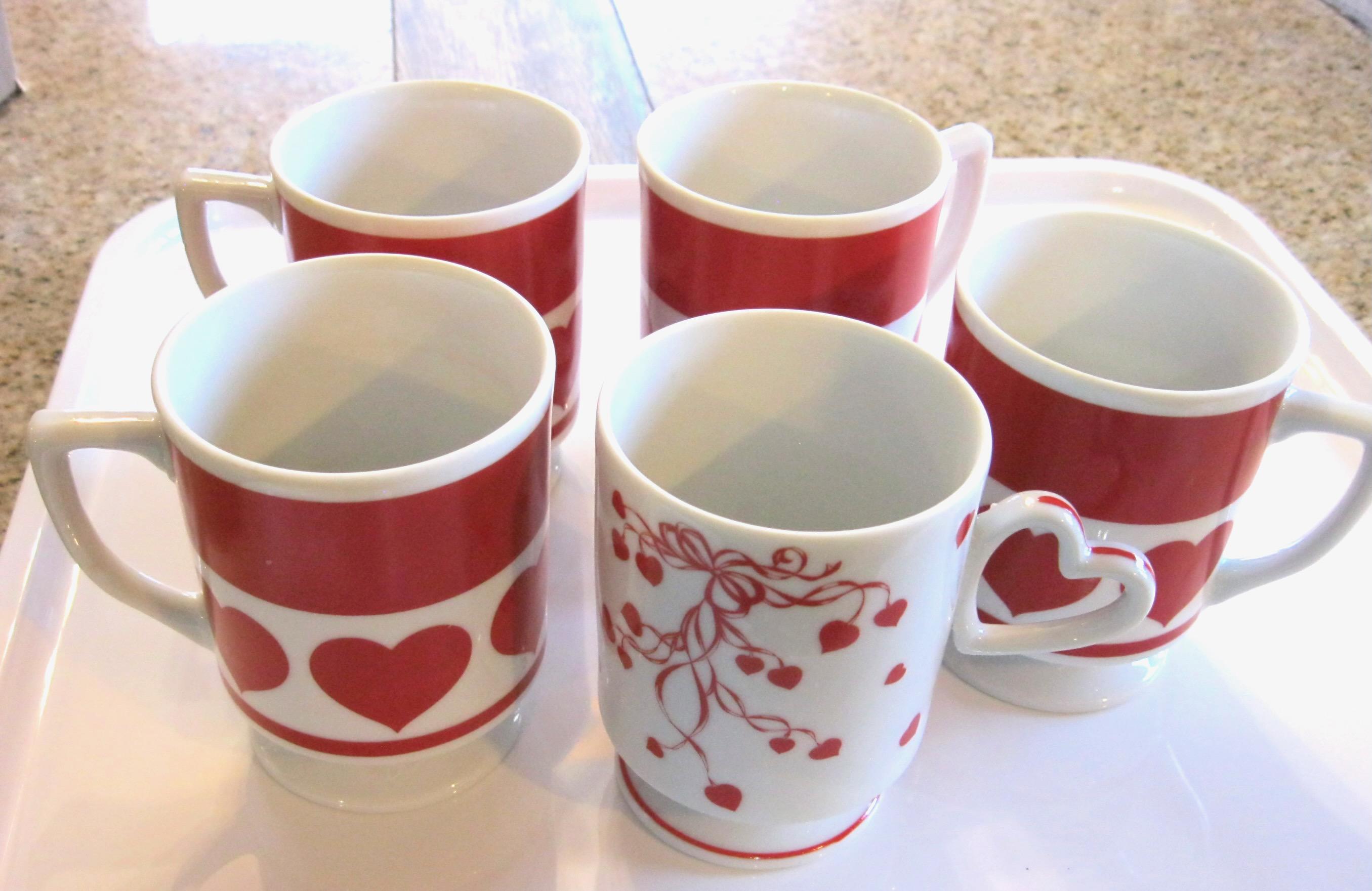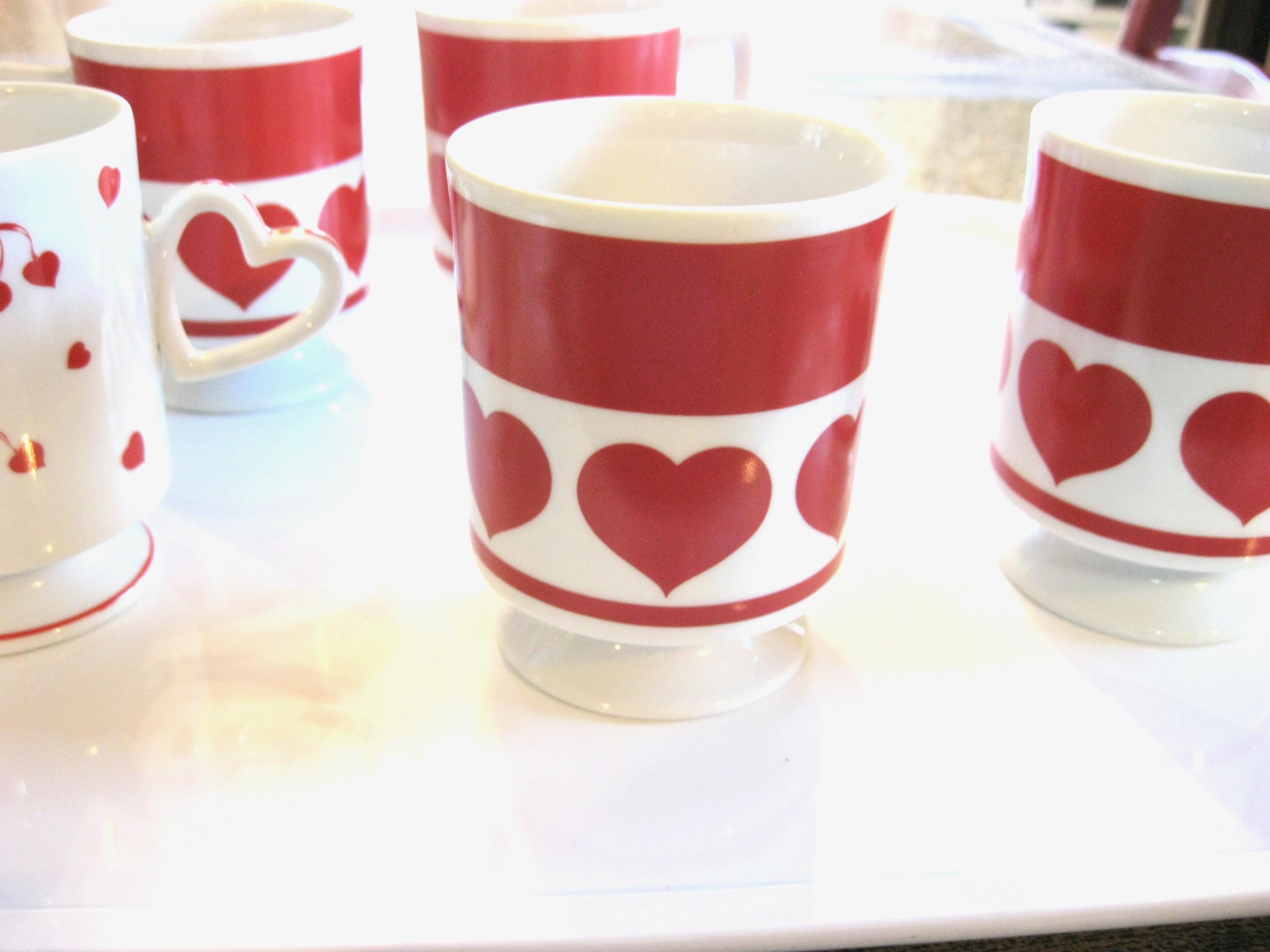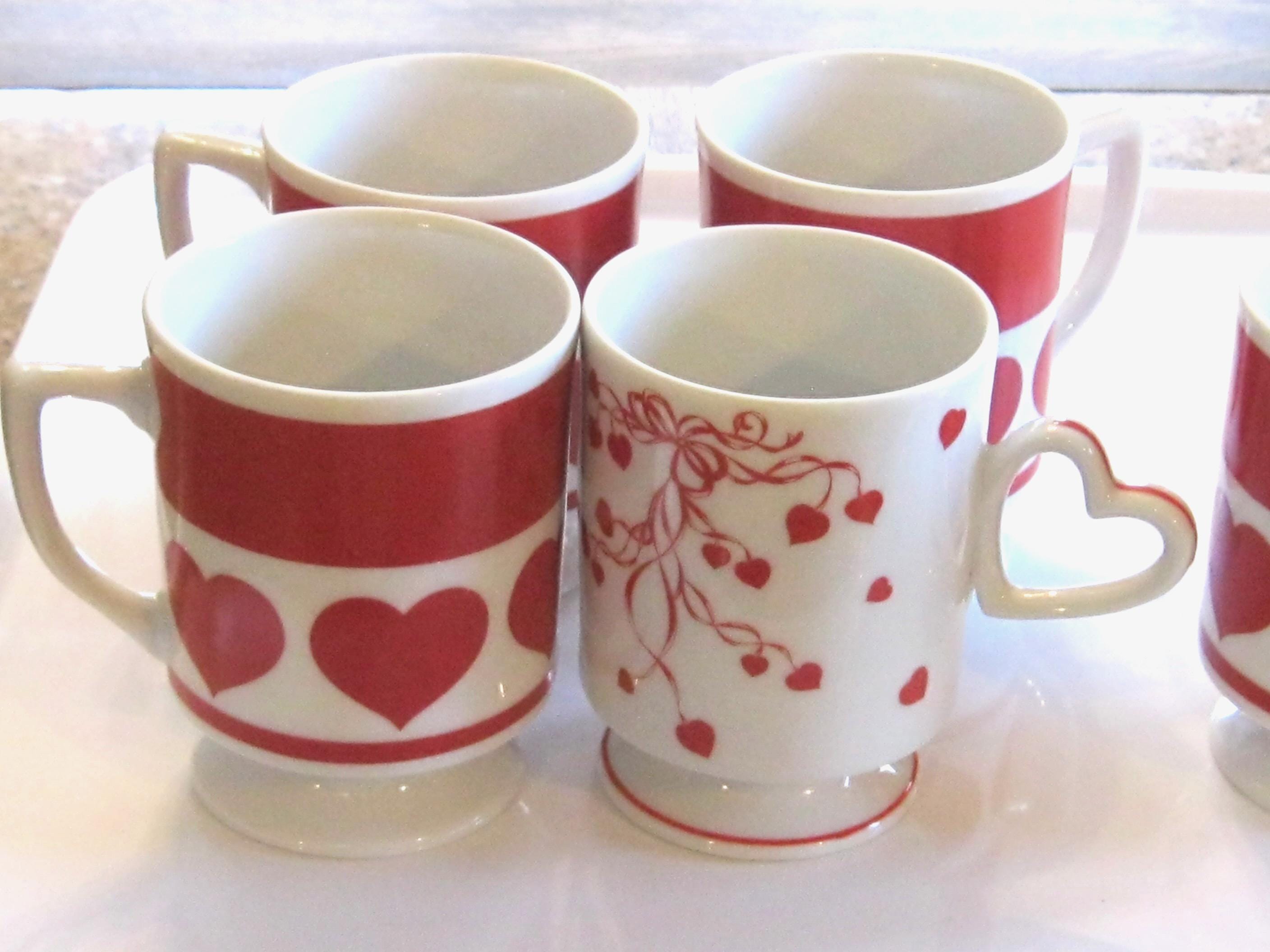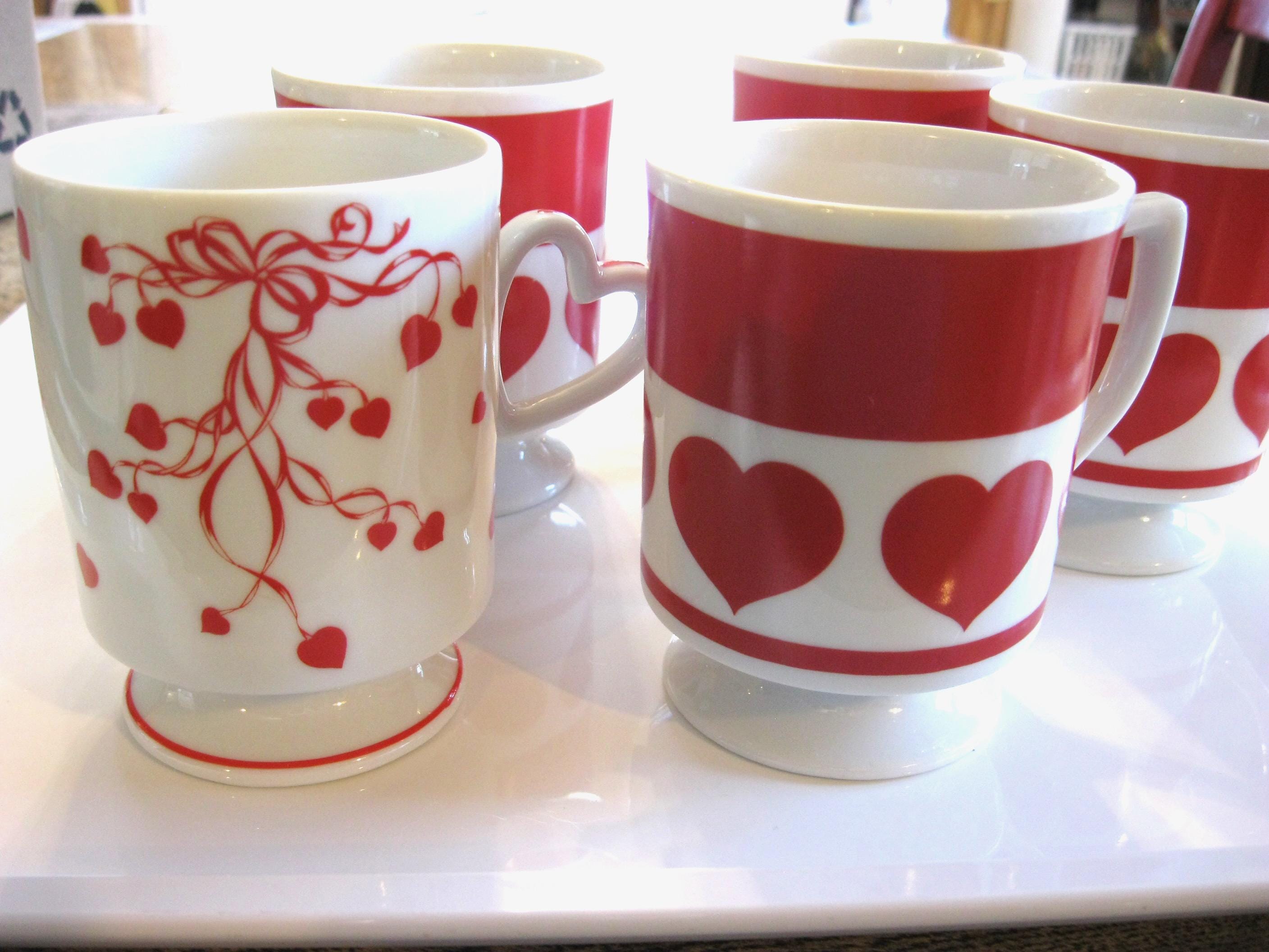 Vintage romantic set or collection of footed Lefton mugs with hearts: