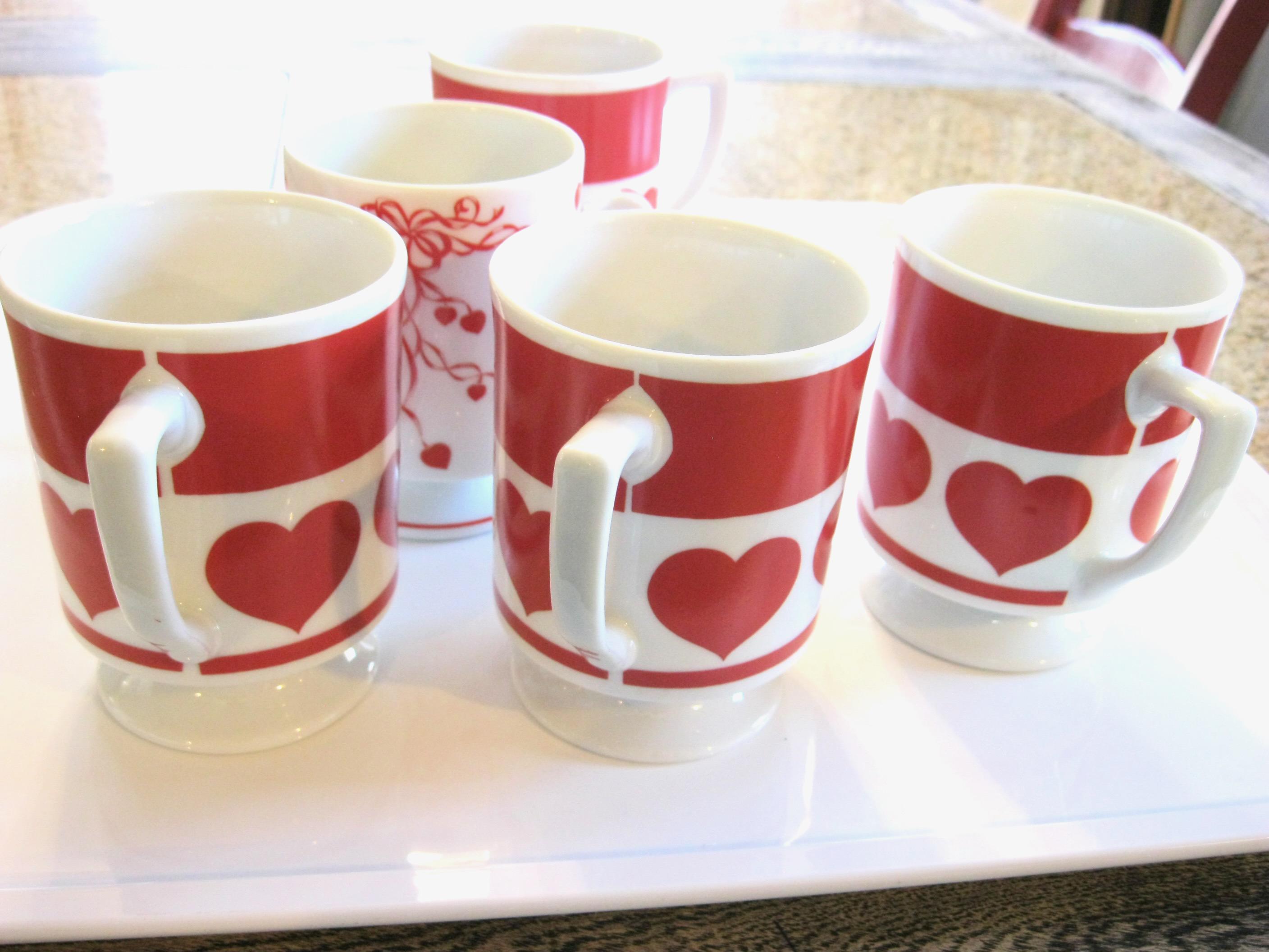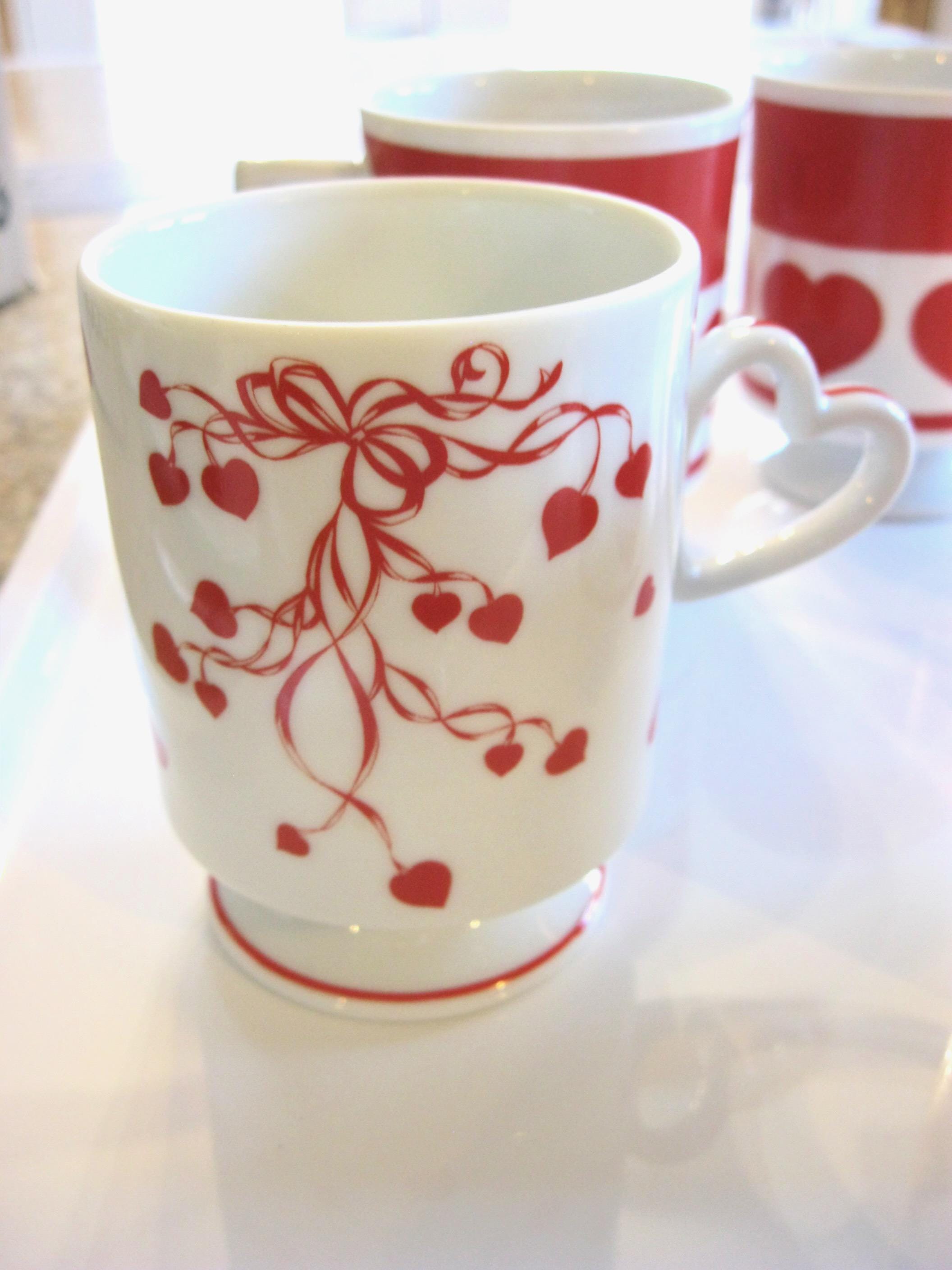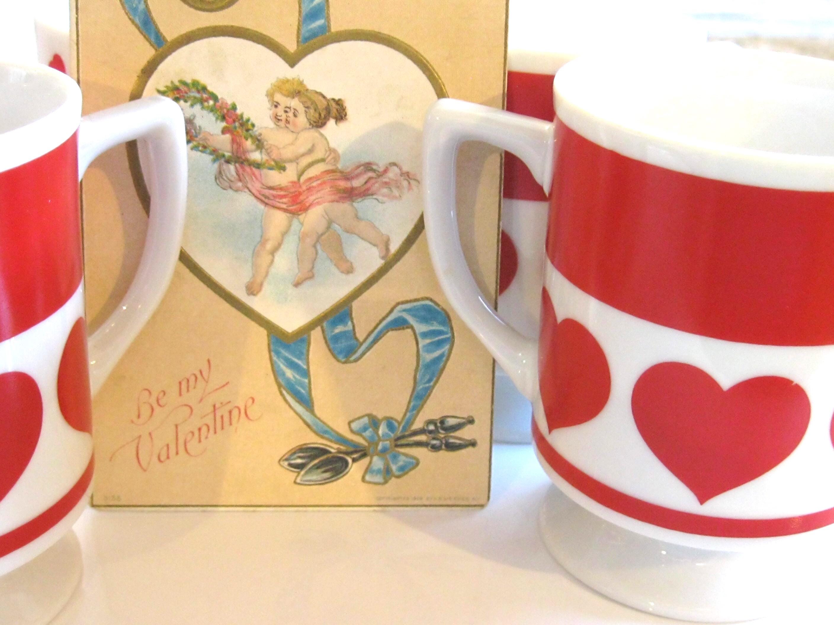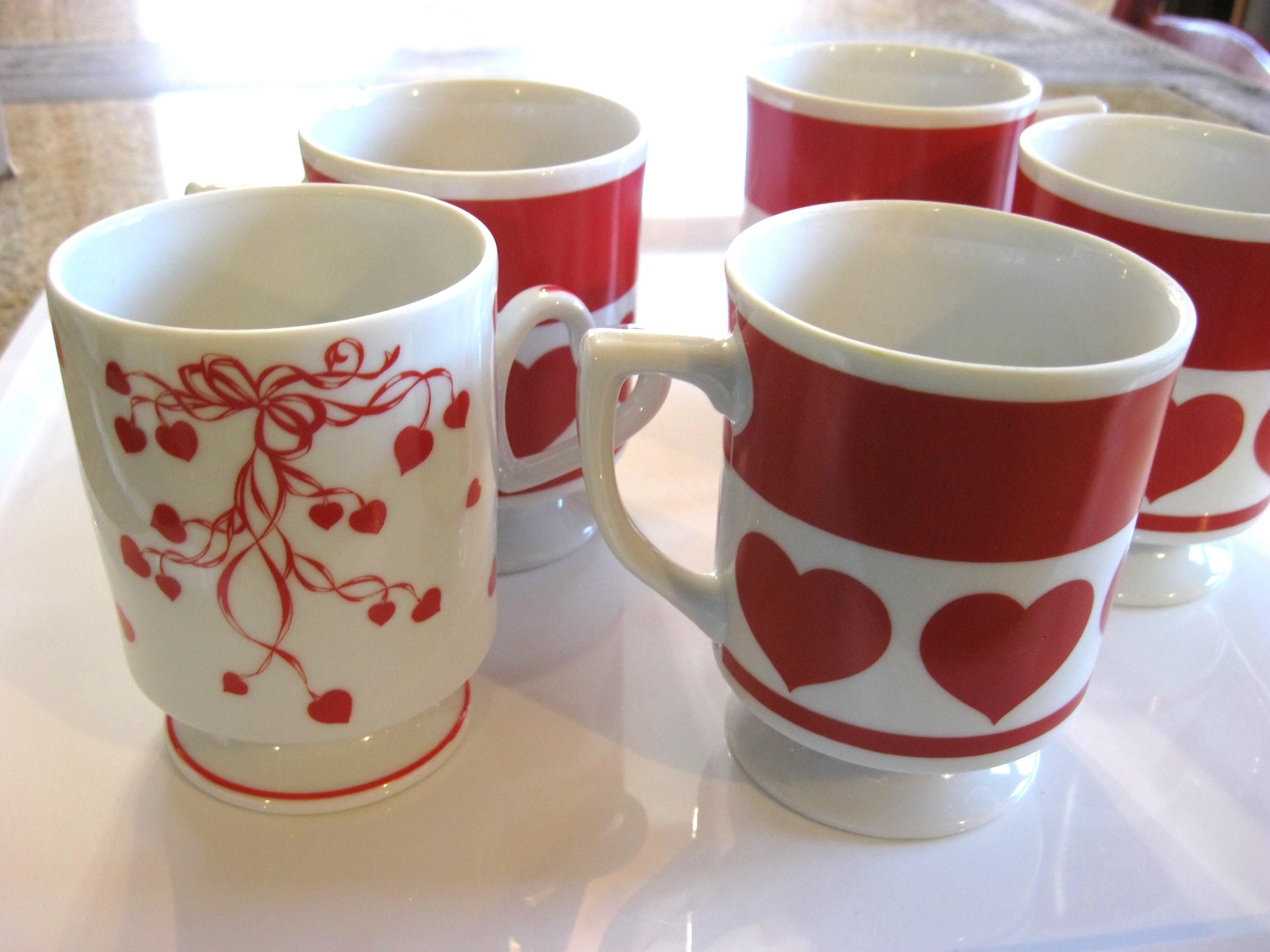 Vintage romantic set or collection of footed Lefton mugs with hearts: