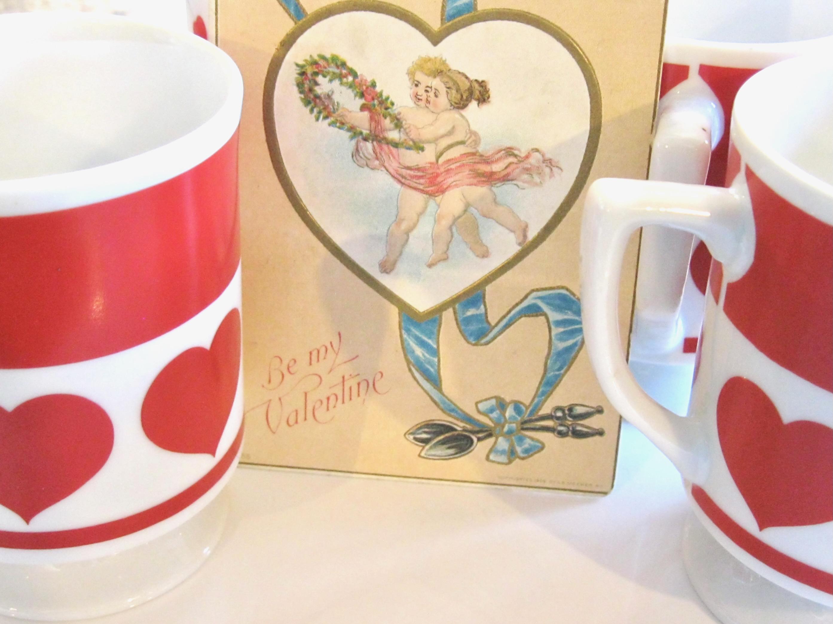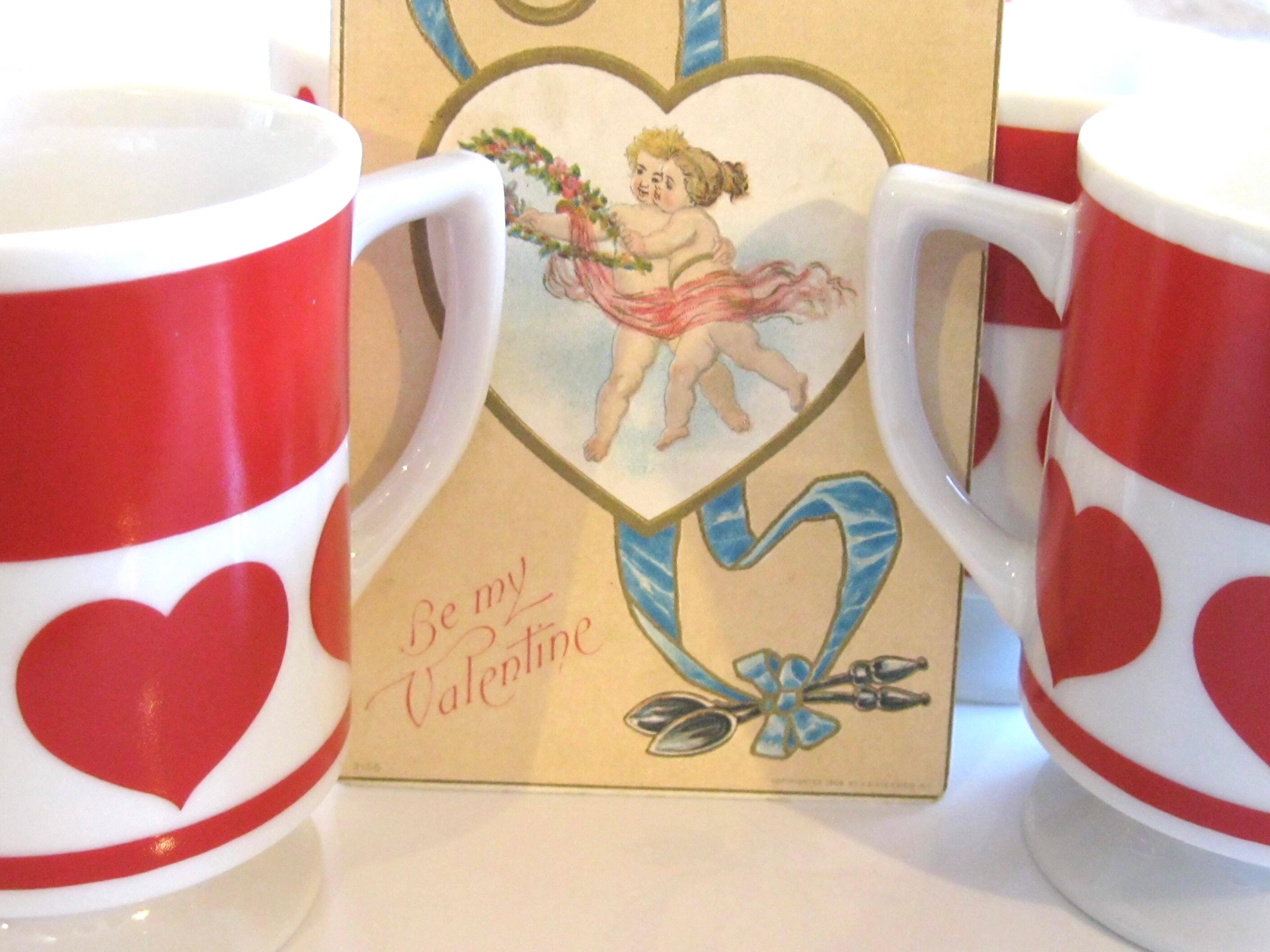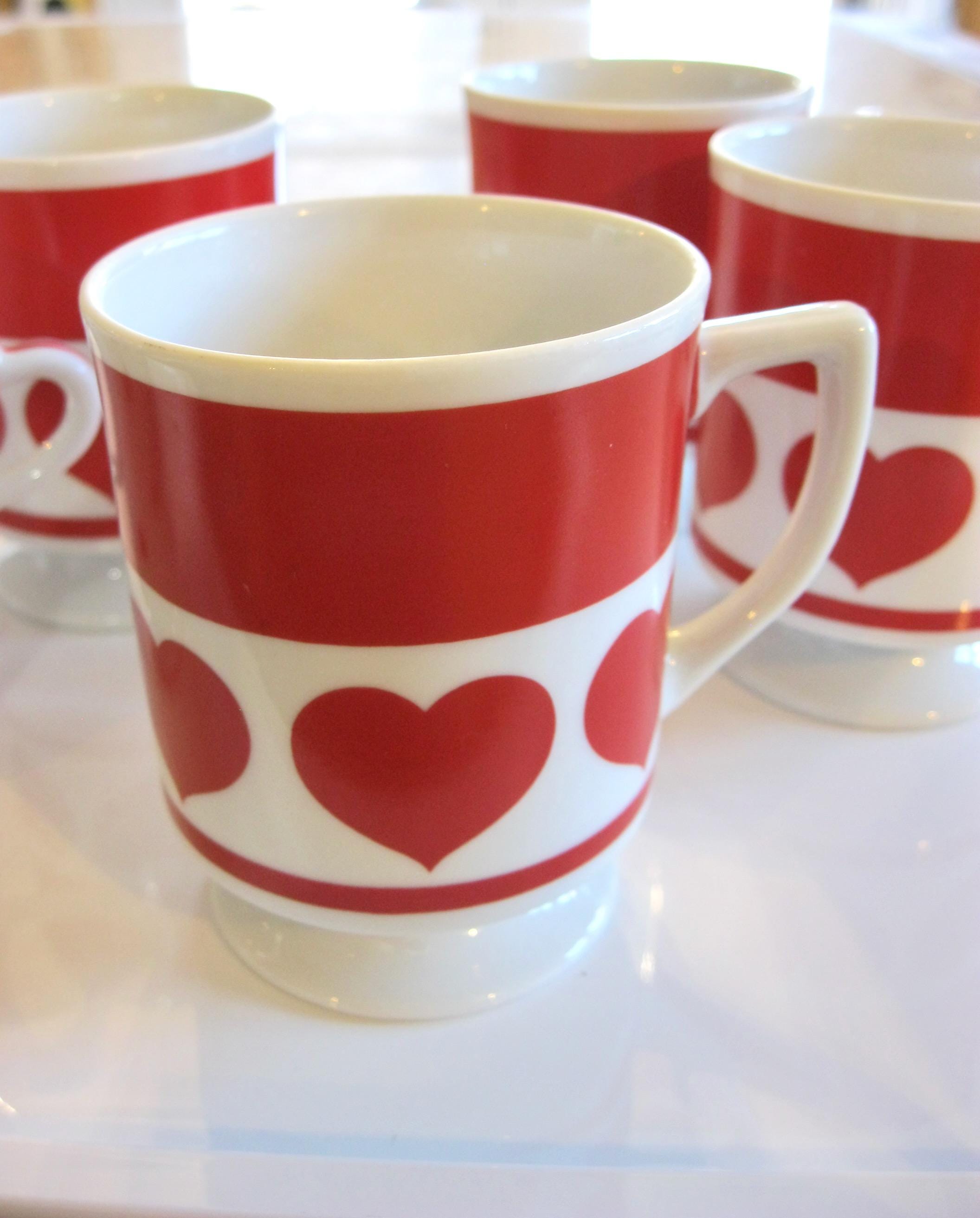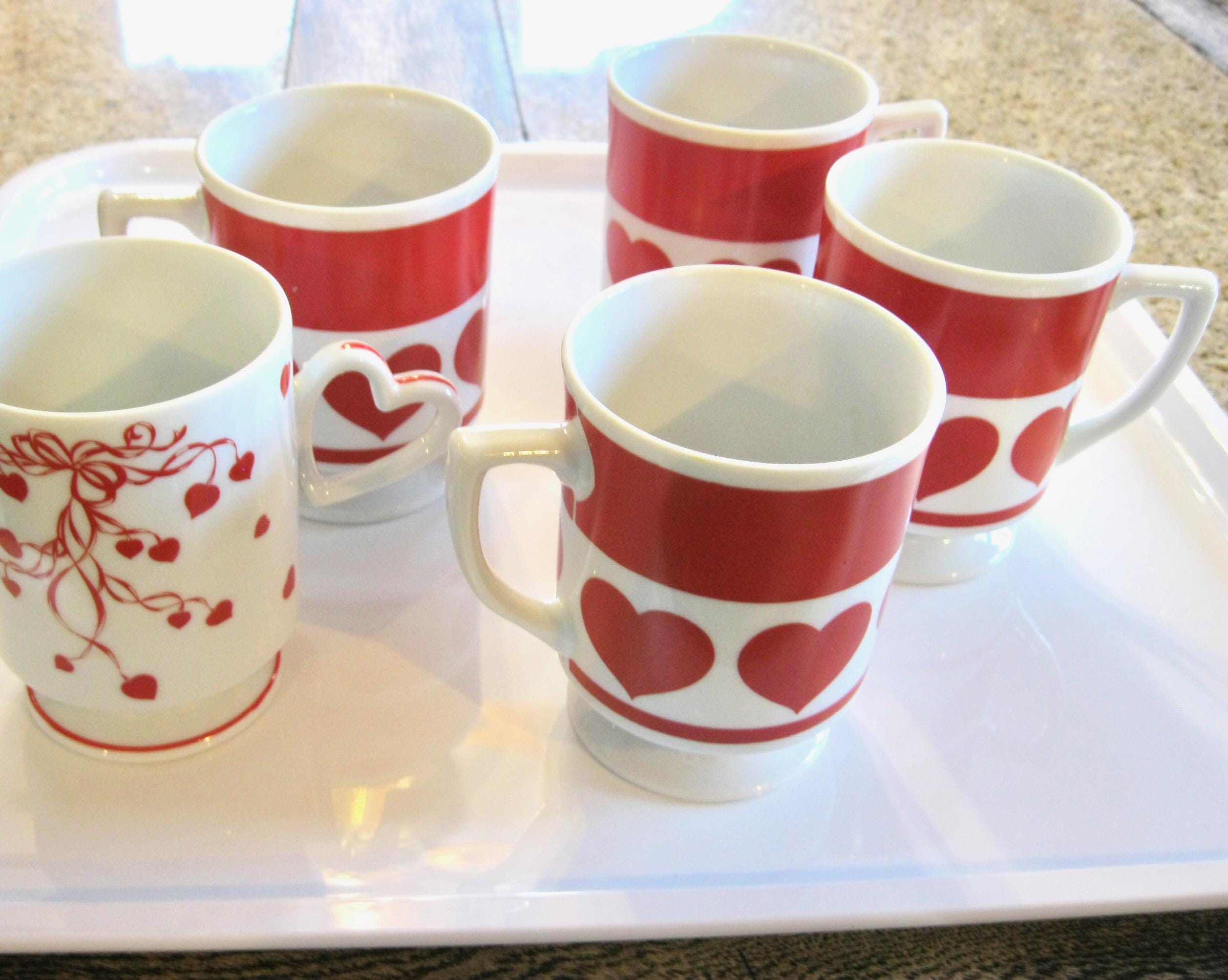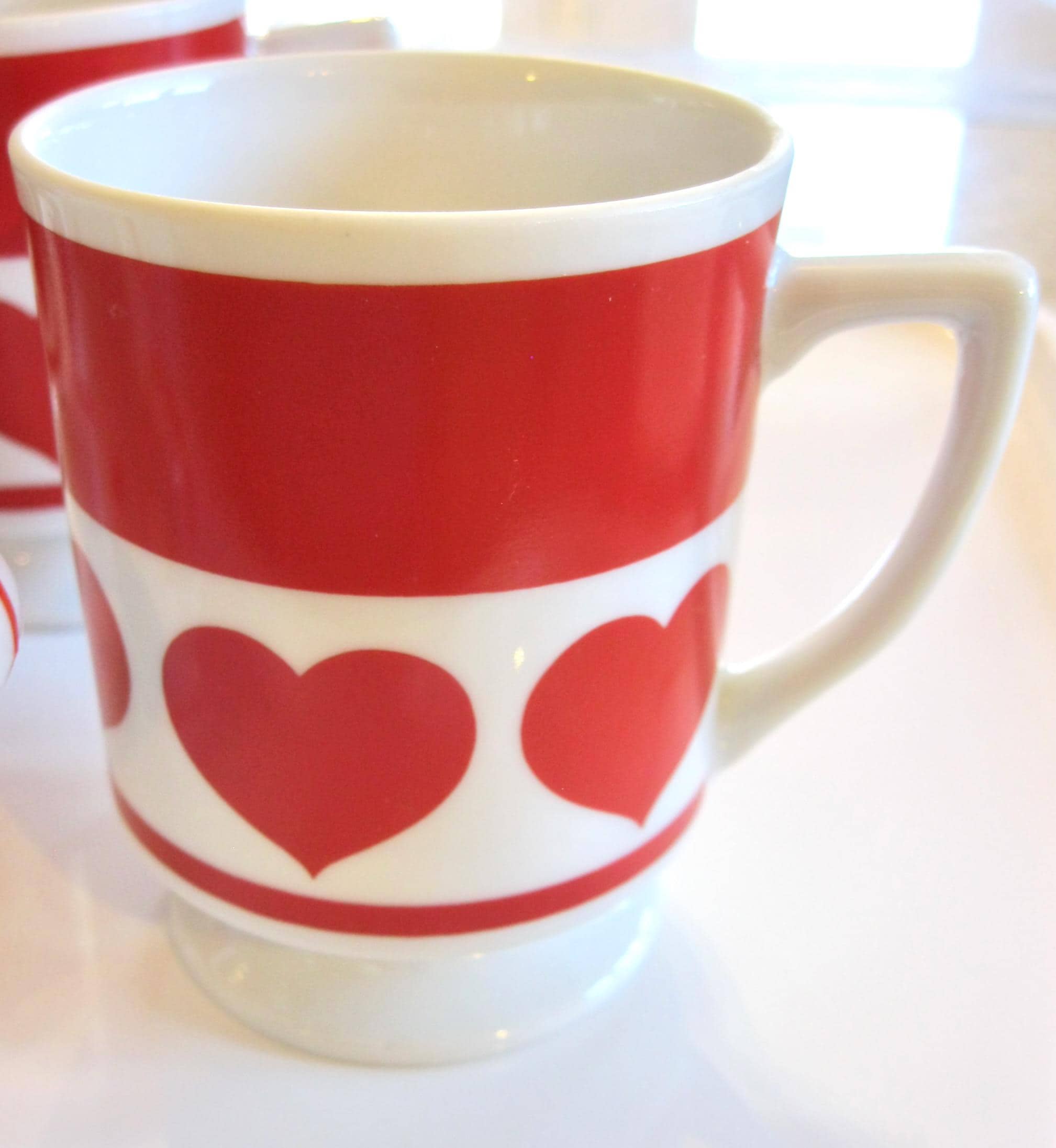 Vintage romantic set or collection of footed Lefton mugs with hearts: