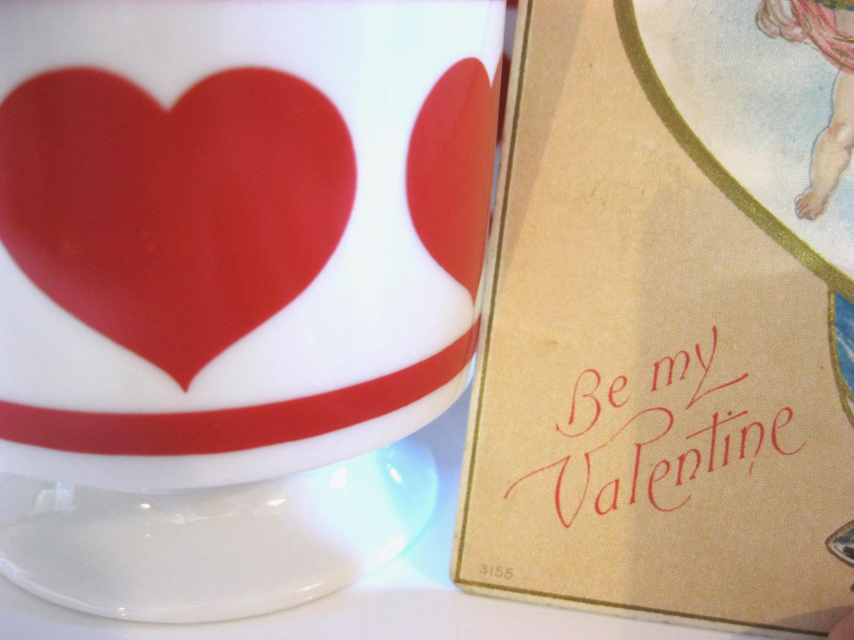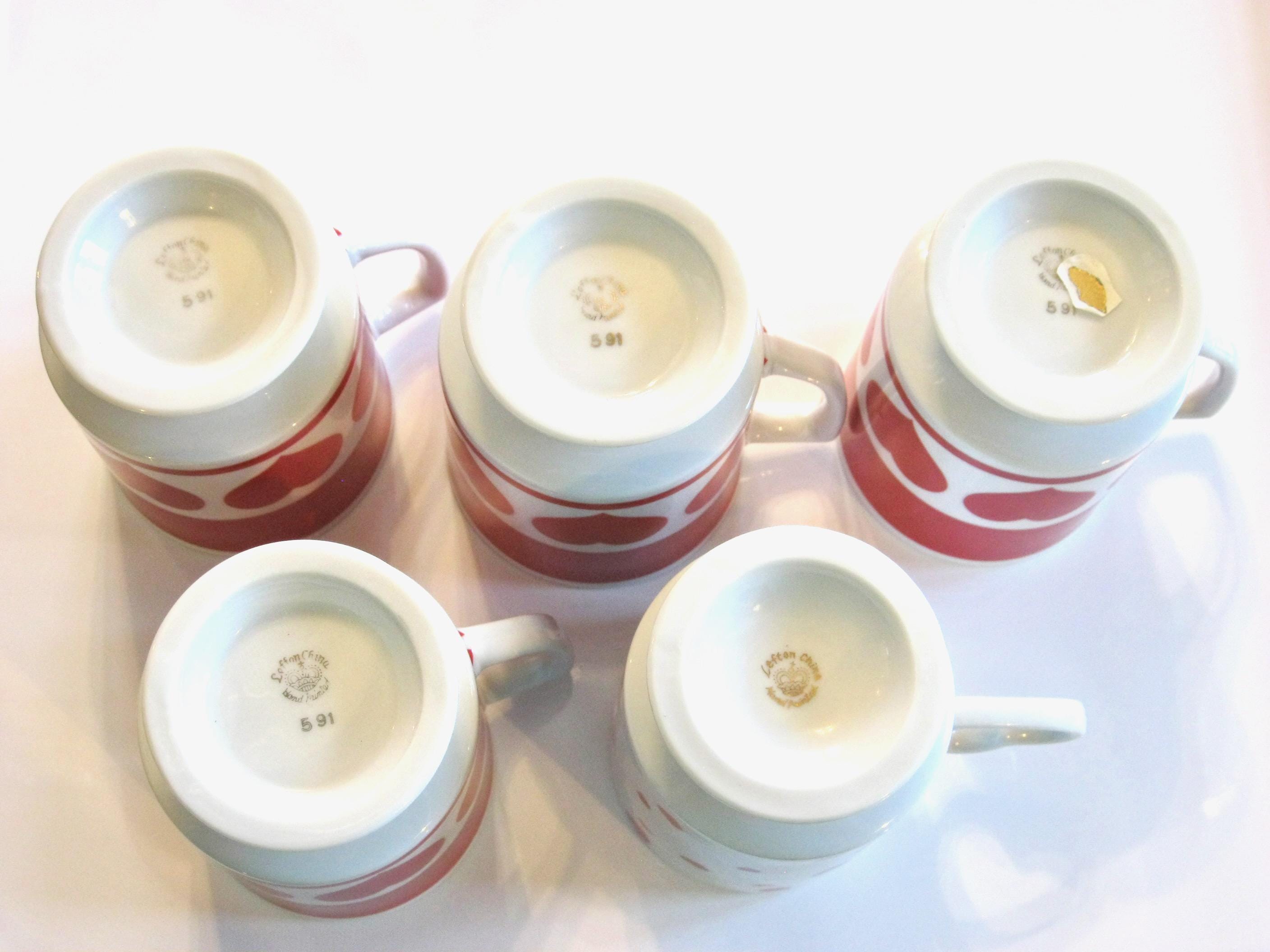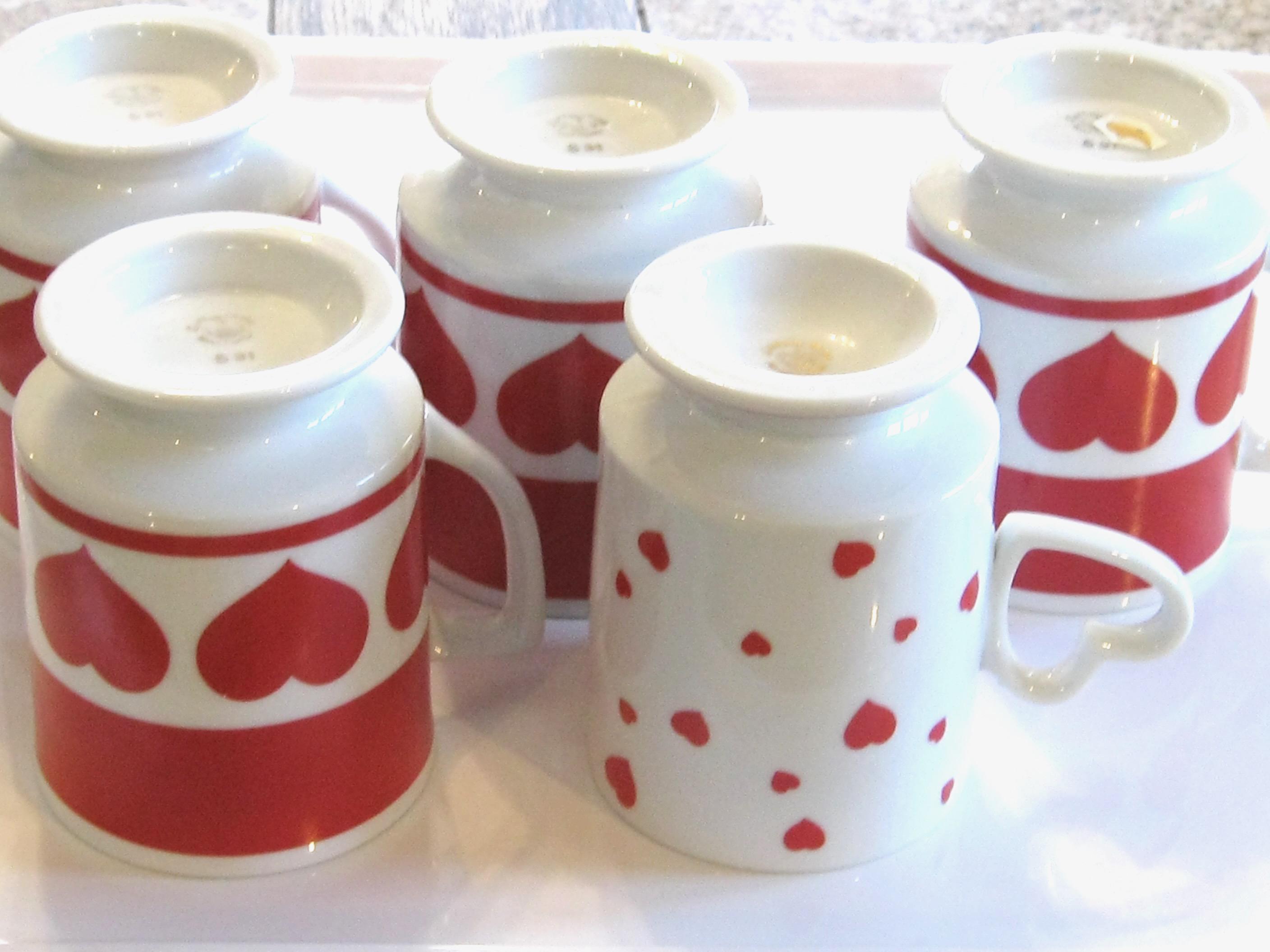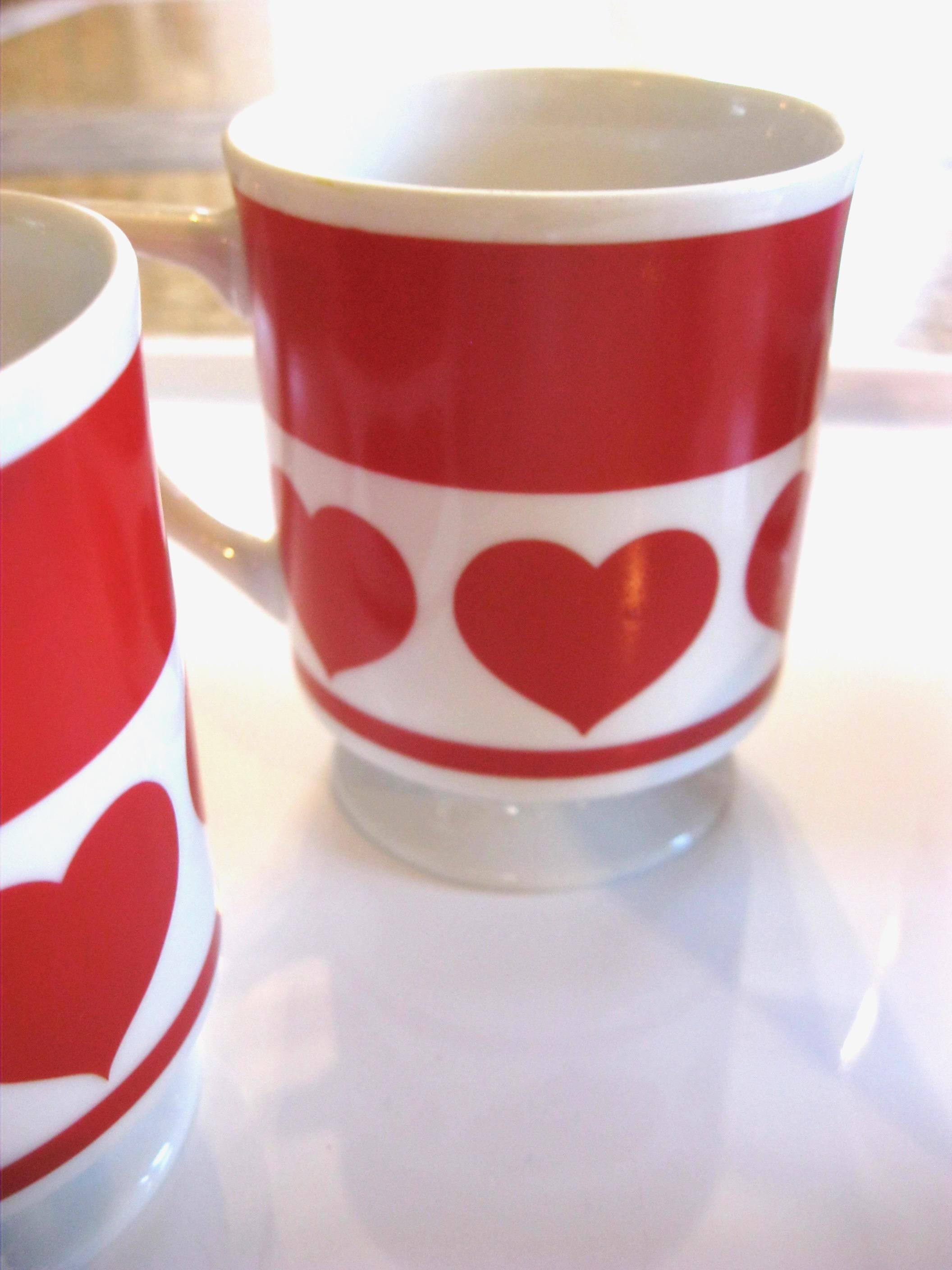 Vintage romantic set or collection of footed Lefton mugs with hearts: