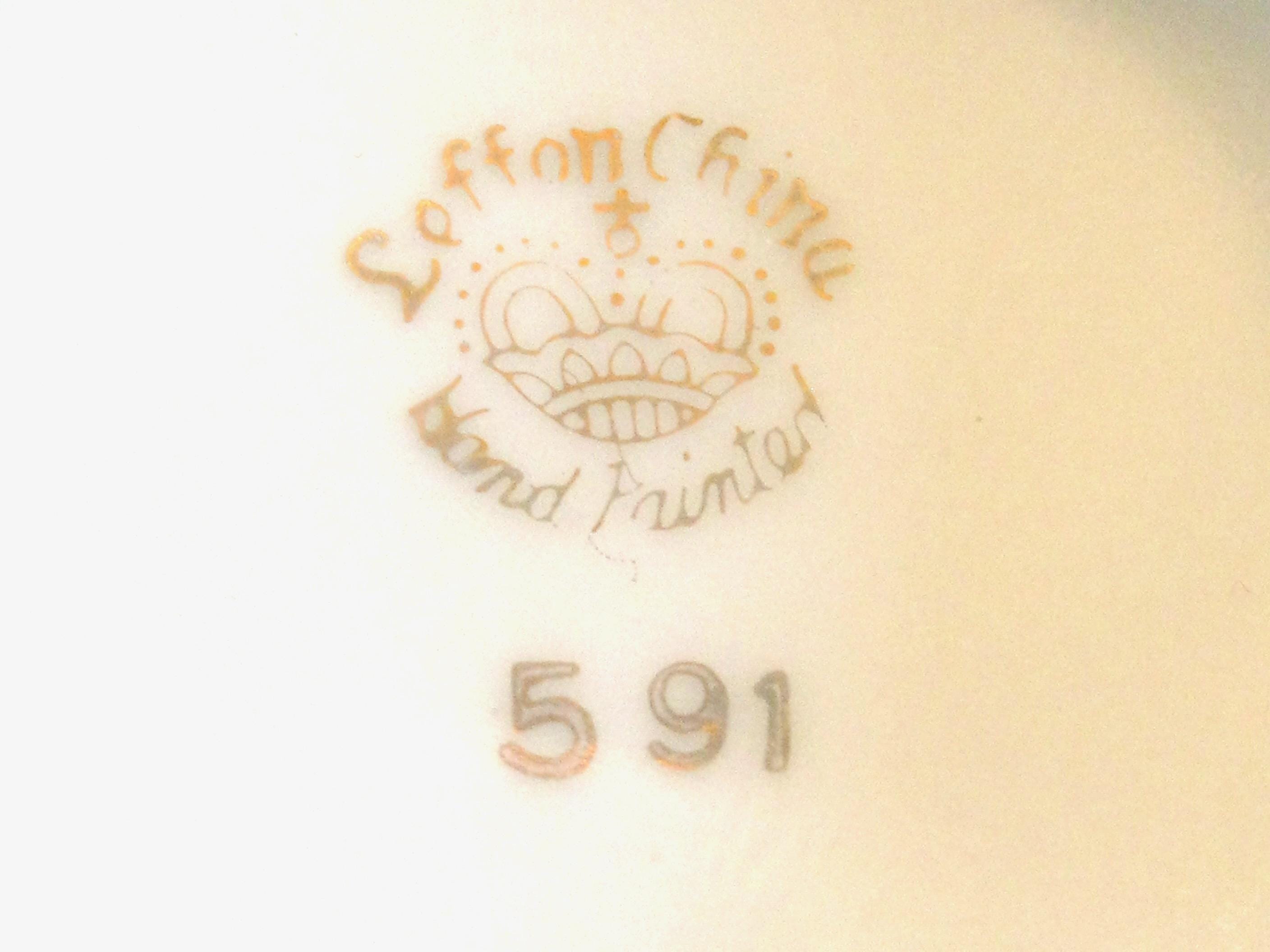 MARKINGS: Metallic gold gilding or painted Lefton China, Logo, Hand Painted, and 591 (to denote the pattern or design number) on 4 - and additionally one of those 4 has a small bit of original gold tag remaining - and the single has all of the same - minus the 591