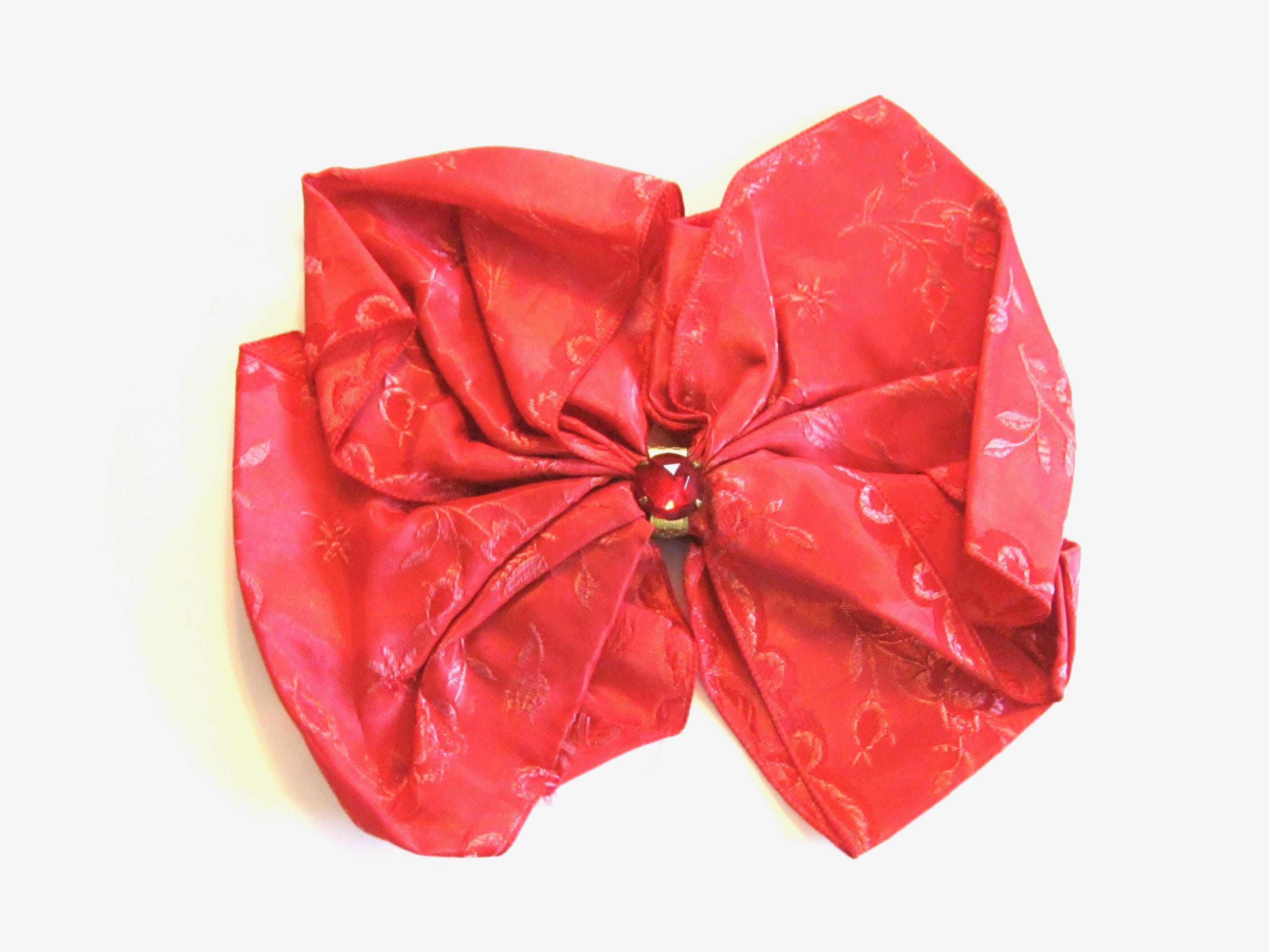 ~ Hinged tension clip opens to hold additional item(s) - included is (assumed) original oversized red on red rose patterned jacquard woven wide ribbon bow that fits and works perfectly with the piece
