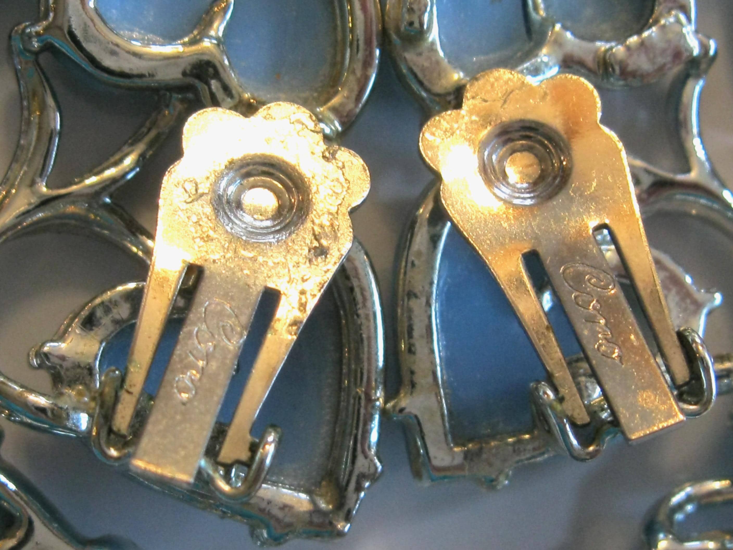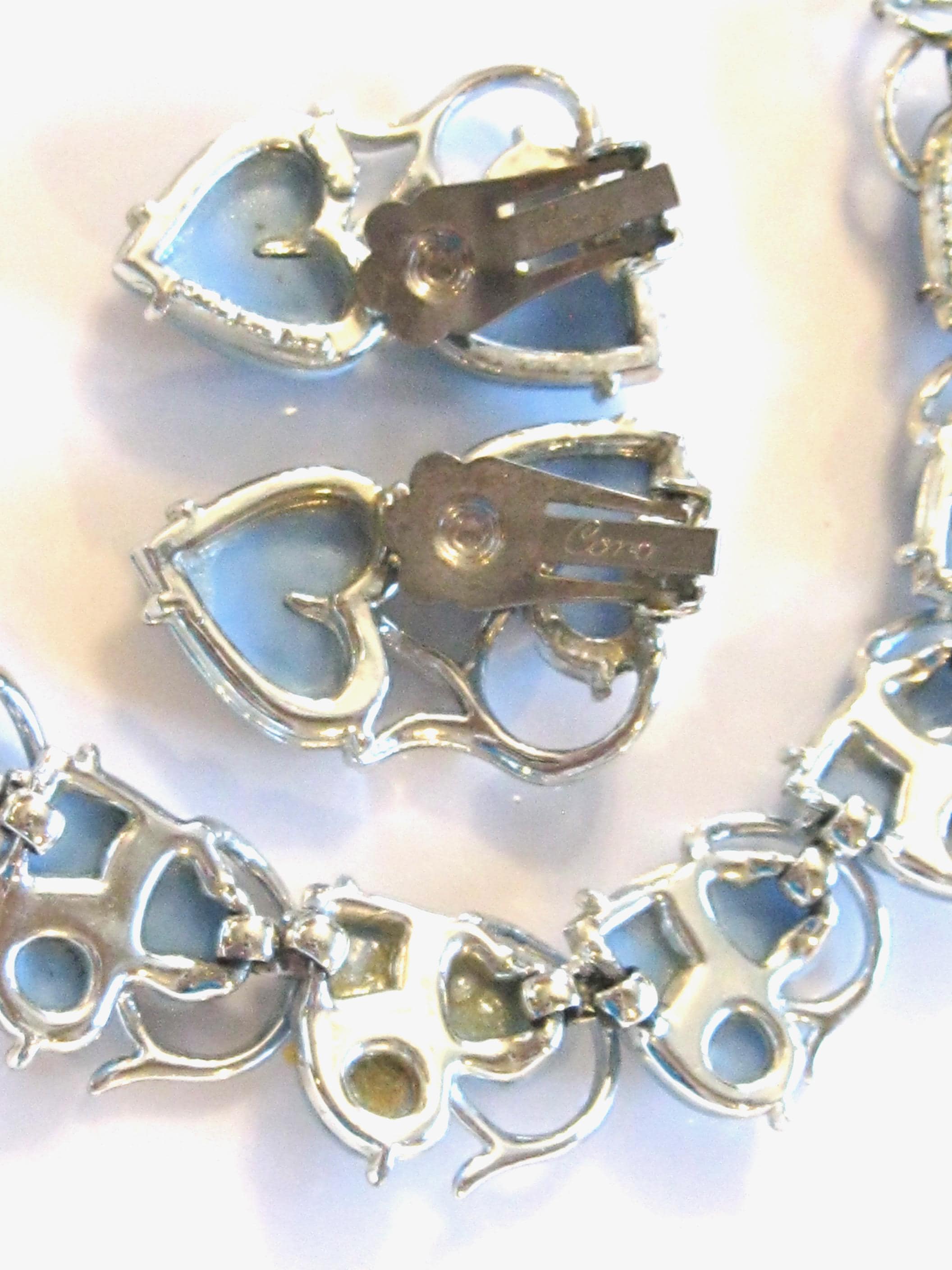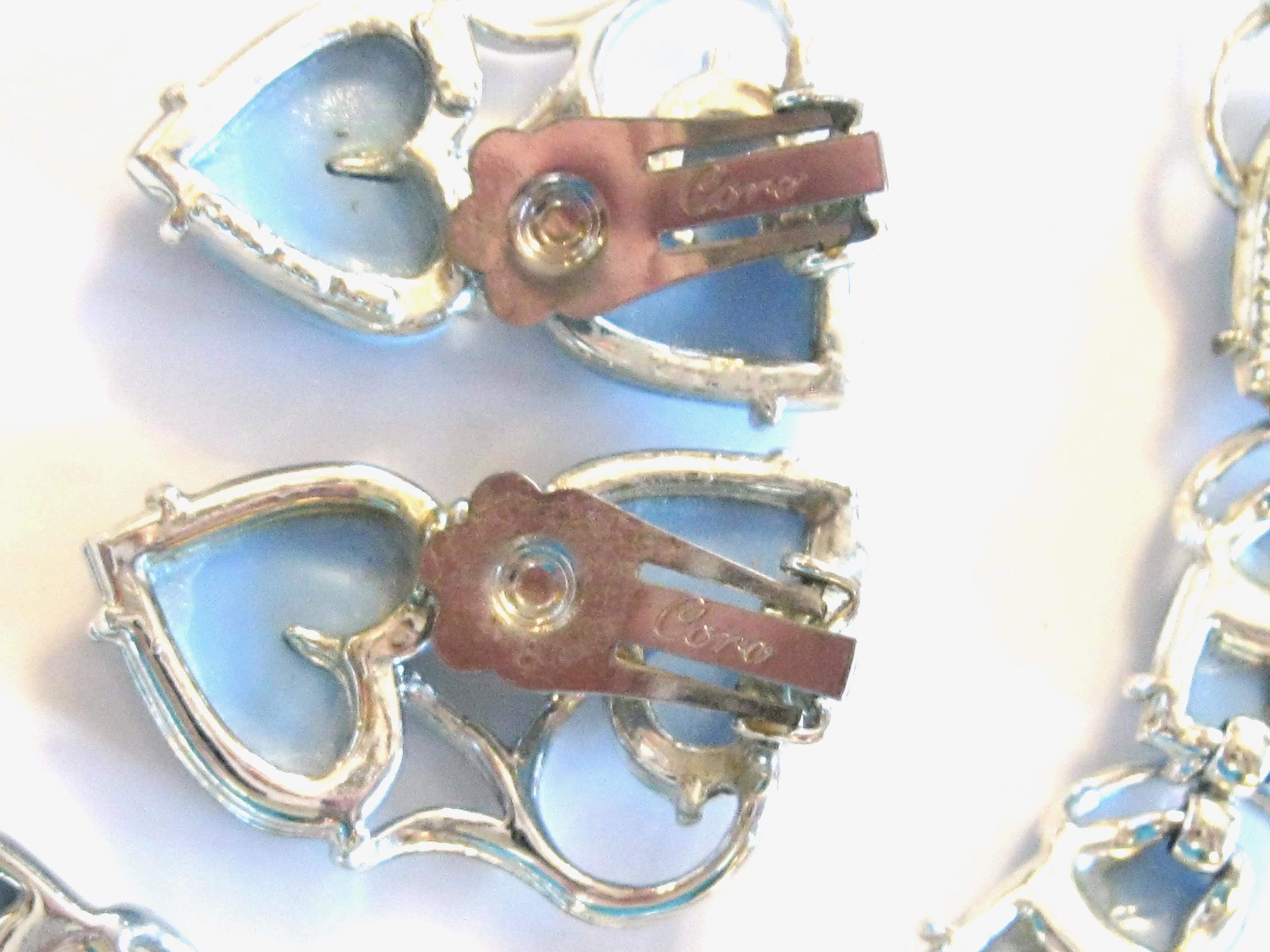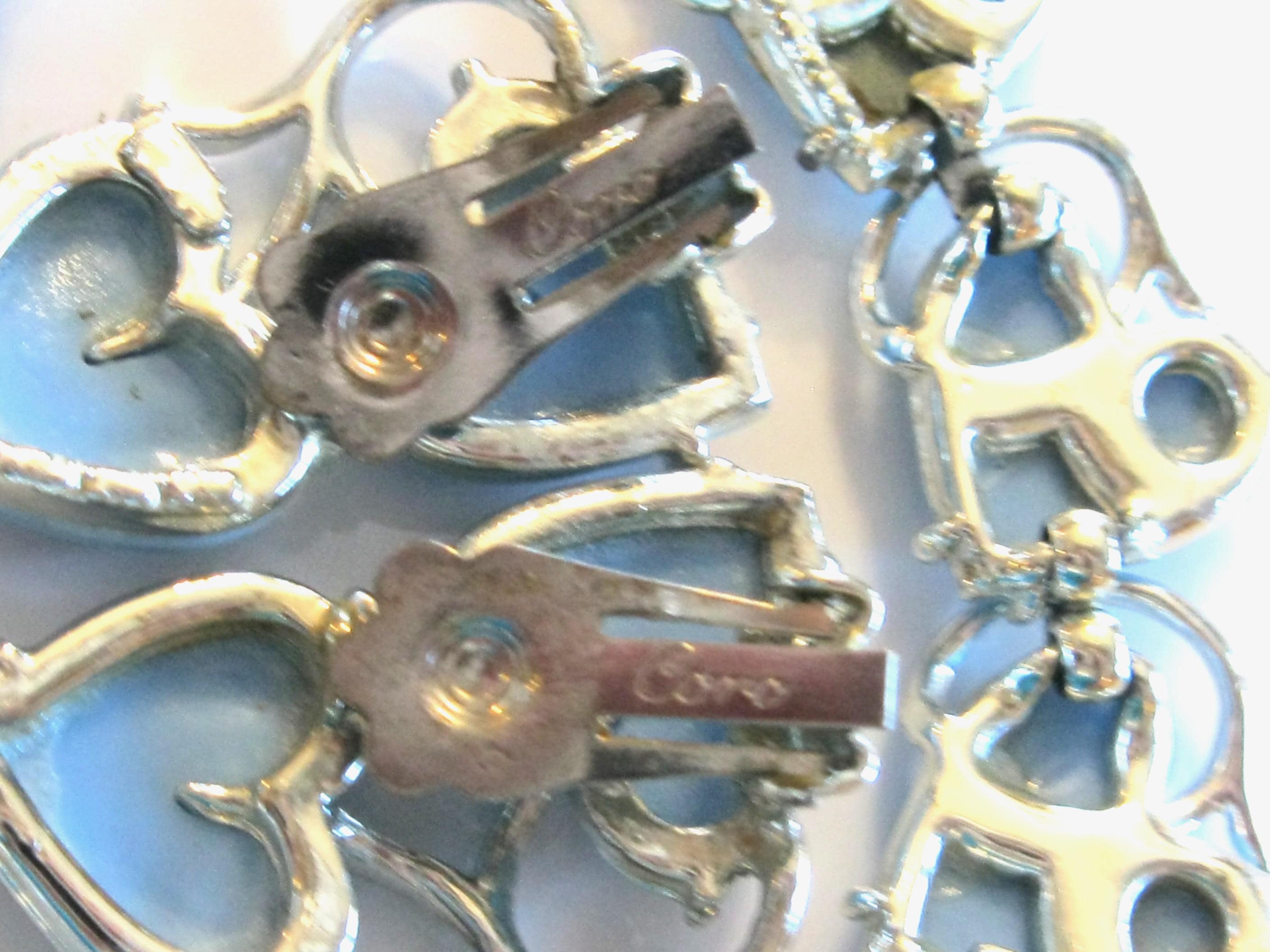 MARKINGS: Each earring back and also the fold over clasp is signed Coro in a script font and there are a few marks that are hard to make out - I believe it may say PAT. PEND.or similar on the back on the heart station by the clasp and on the back of one earring. See pics