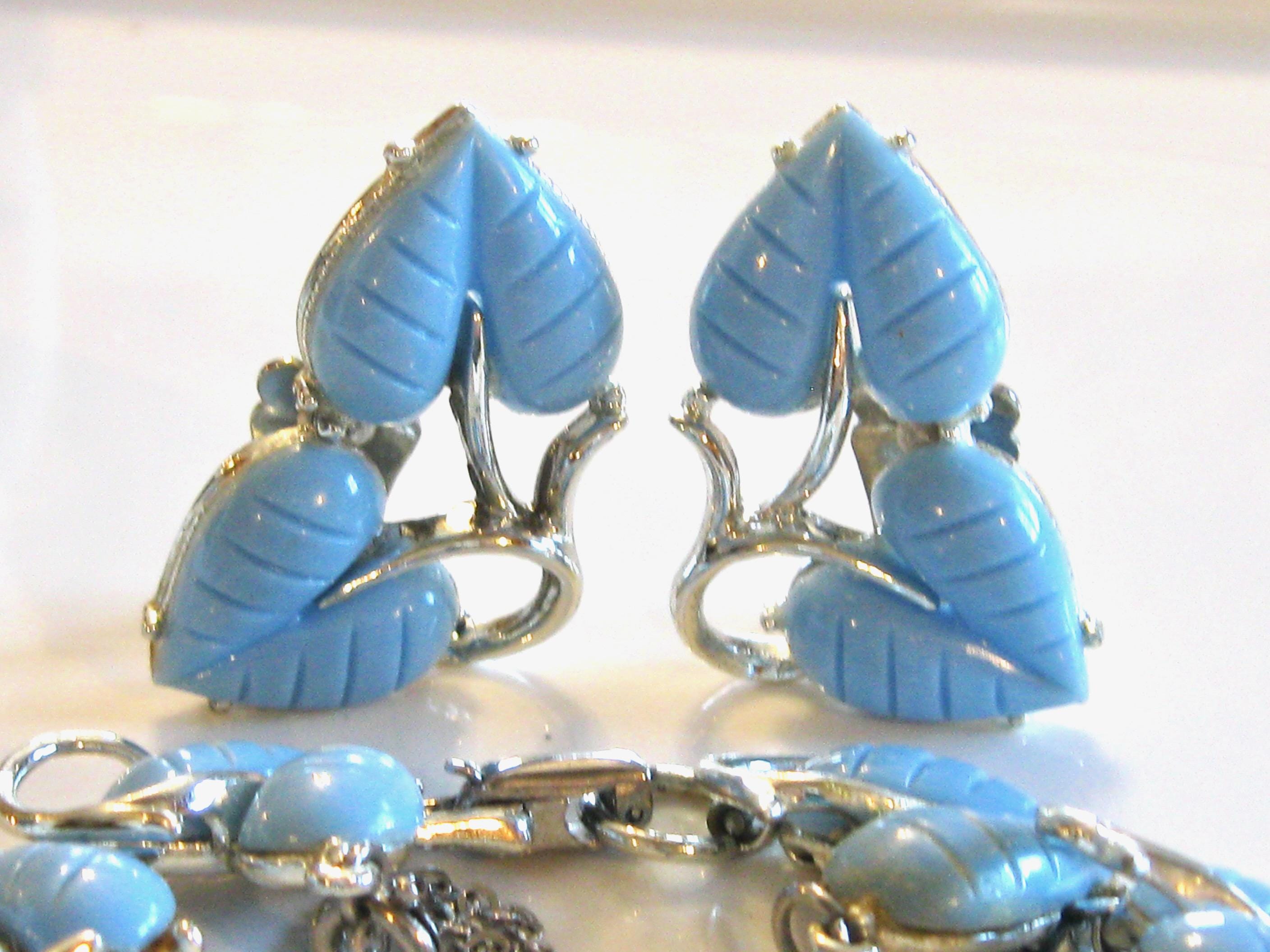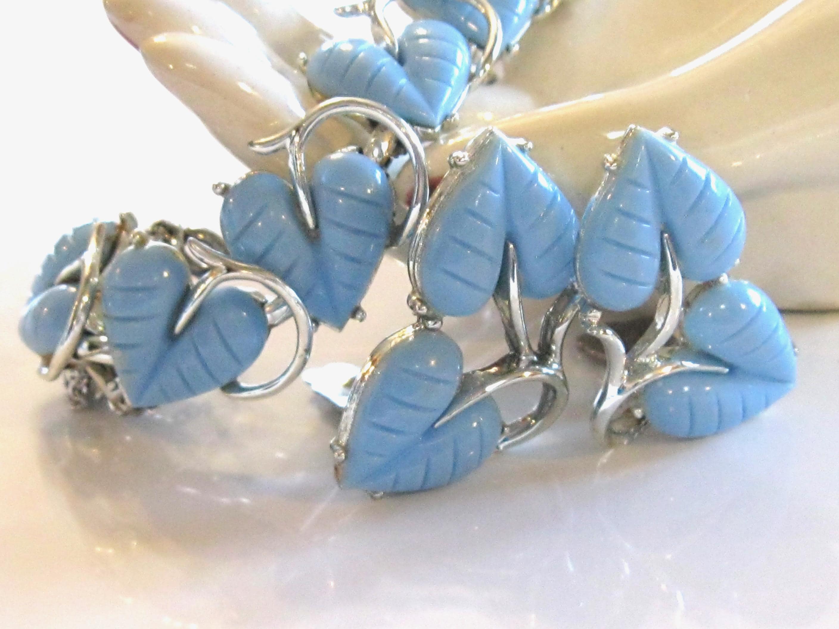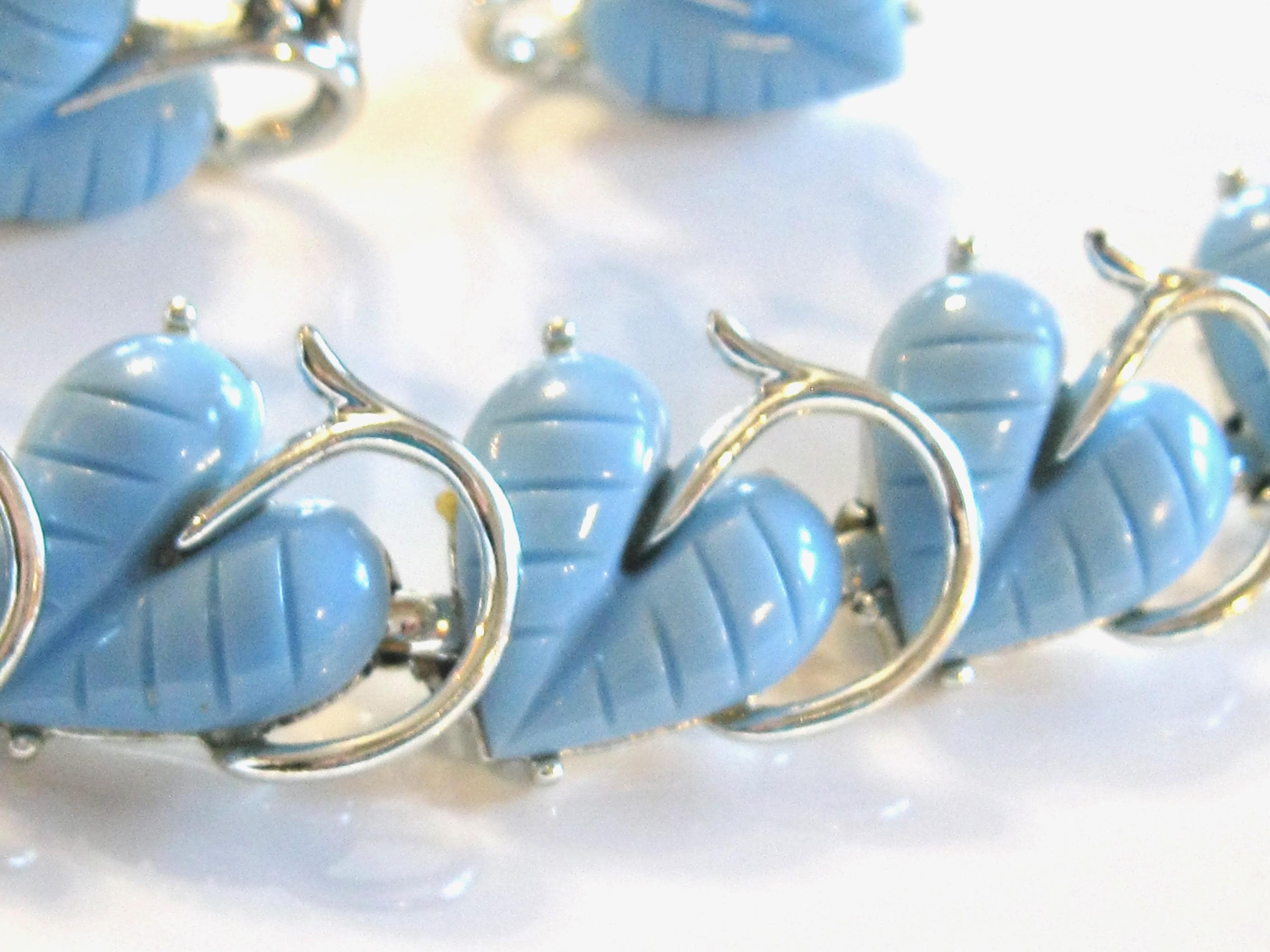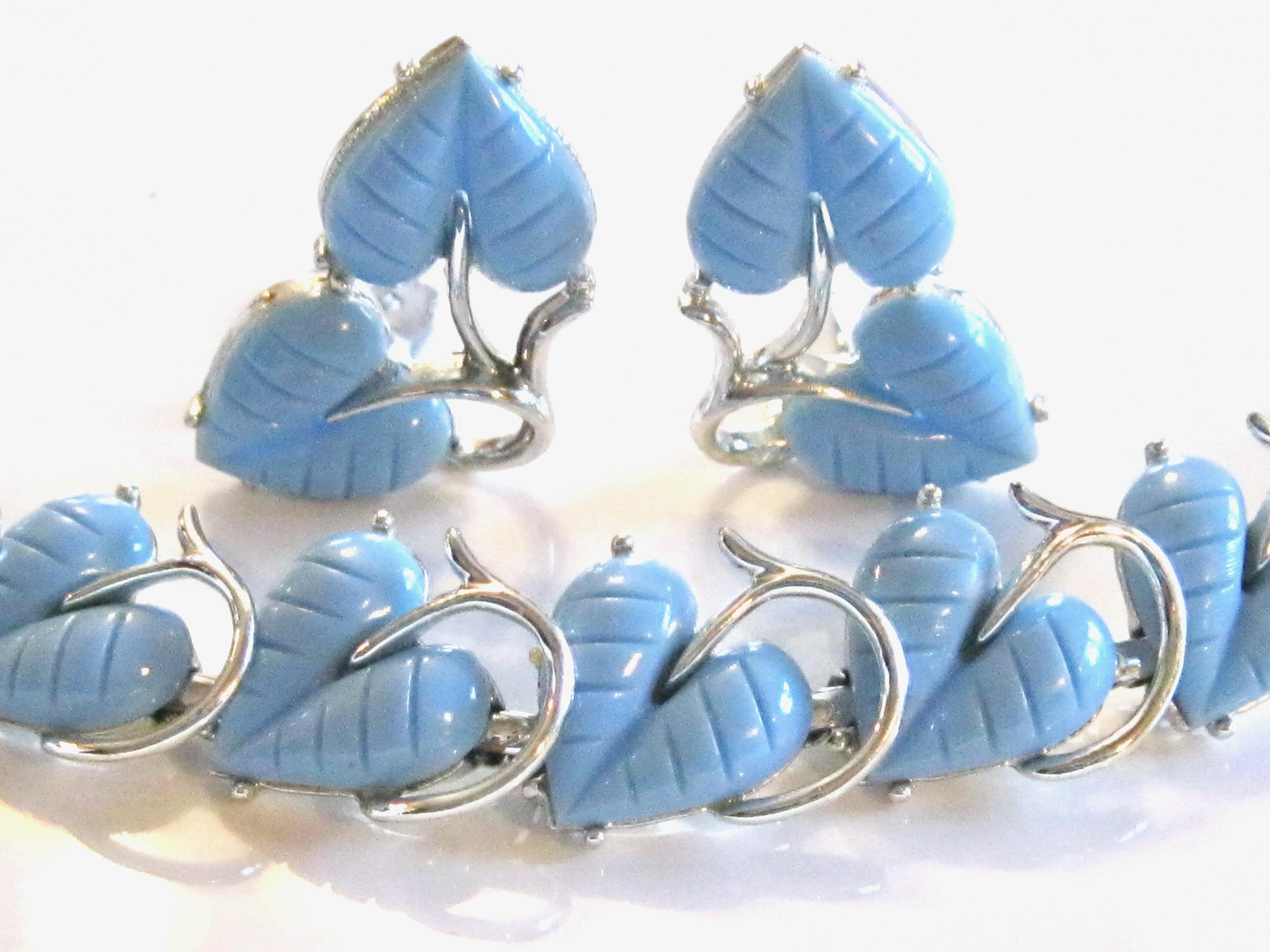 JUST FOR FUN - AI DESCRIPTION: This vintage Coro jewelry set from the 1950s features a blue thermoset heart or leaf bracelet with clip earrings in a silver toned setting. Signed by the brand, this retro set is a perfect addition to any woman's jewelry collection. Made of blue plastic, this set captures the style and elegance of the mid-century era with its unique design and vibrant color. Ideal for those who appreciate vintage and antique jewelry, this set is a timeless piece that exudes charm and sophistication.
