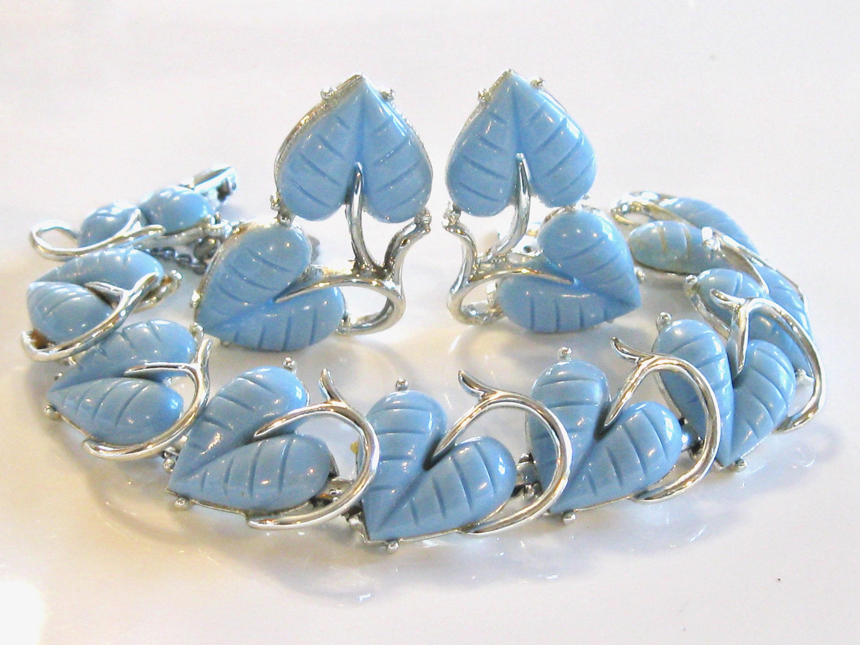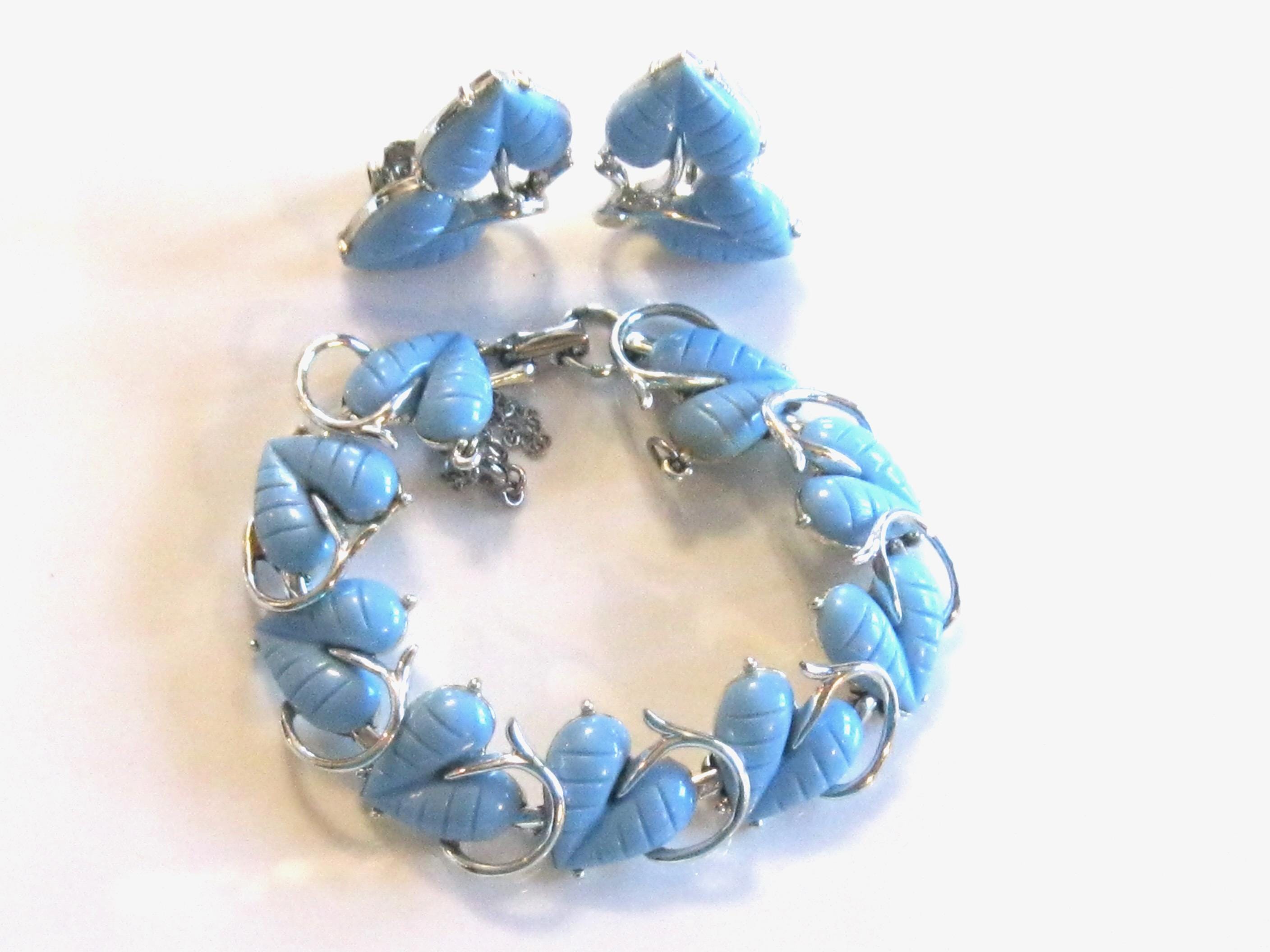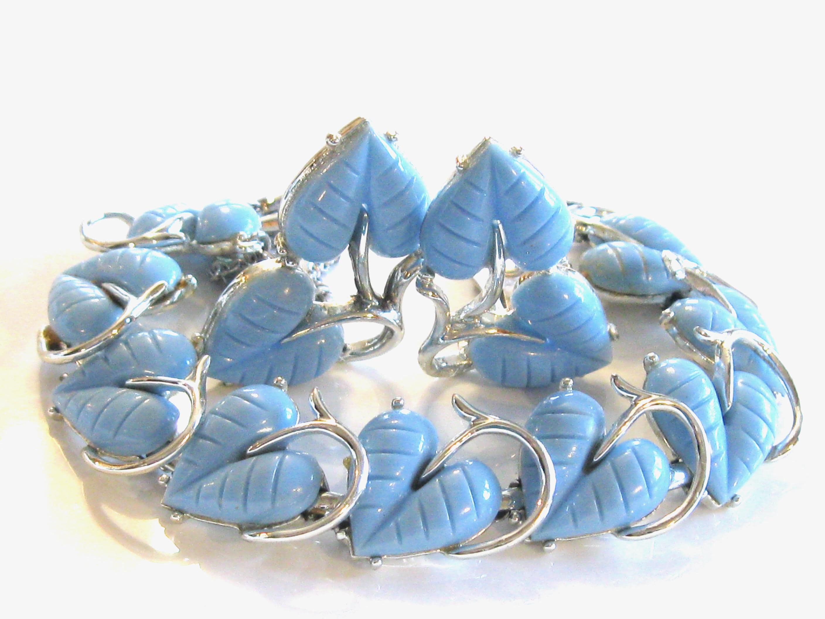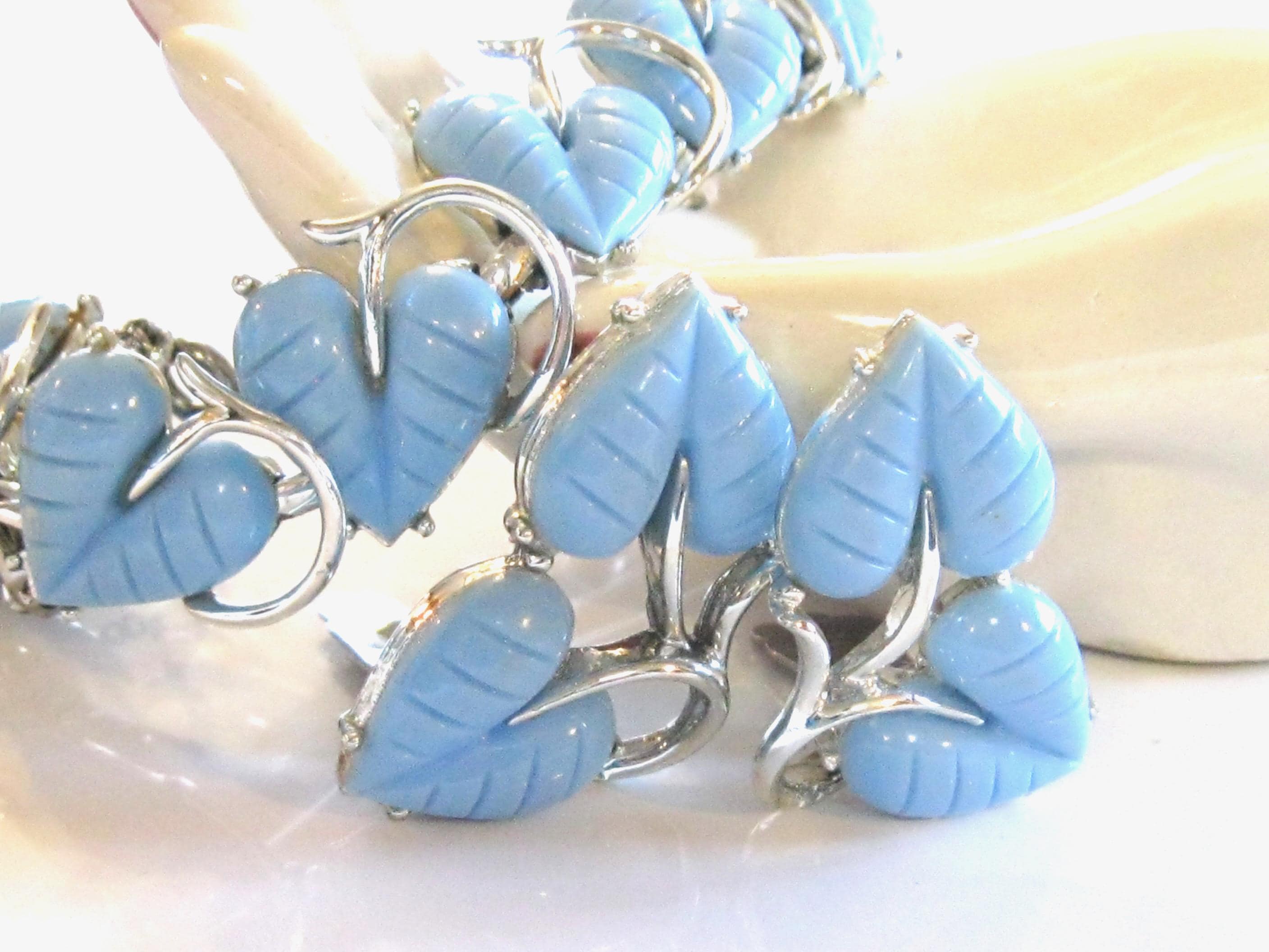 JUST FOR FUN - AI DESCRIPTION: This vintage Coro jewelry set from the 1950s features a blue thermoset heart or leaf bracelet with clip earrings in a silver toned setting. Signed by the brand, this retro set is a perfect addition to any woman's jewelry collection. Made of blue plastic, this set captures the style and elegance of the mid-century era with its unique design and vibrant color. Ideal for those who appreciate vintage and antique jewelry, this set is a timeless piece that exudes charm and sophistication.