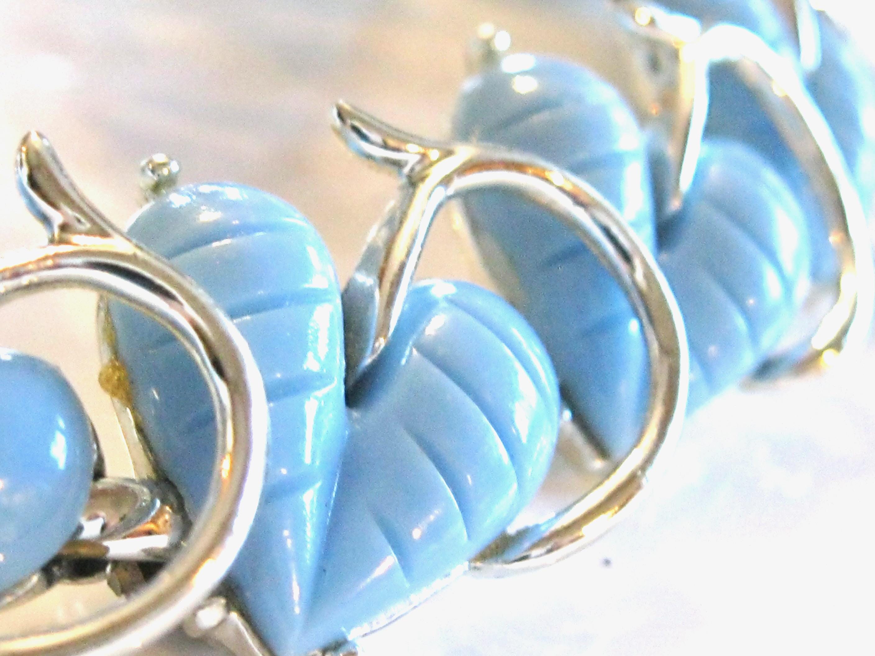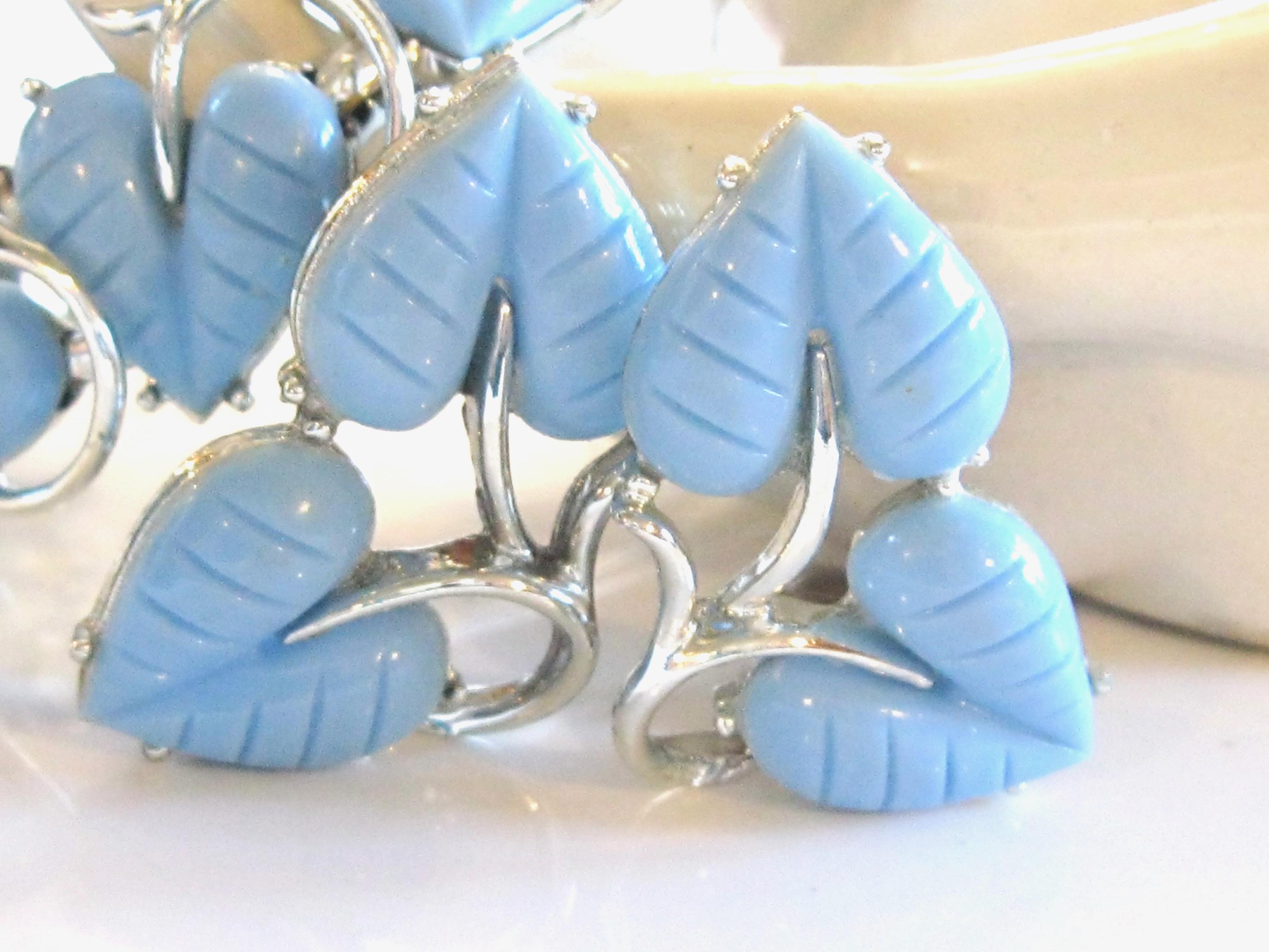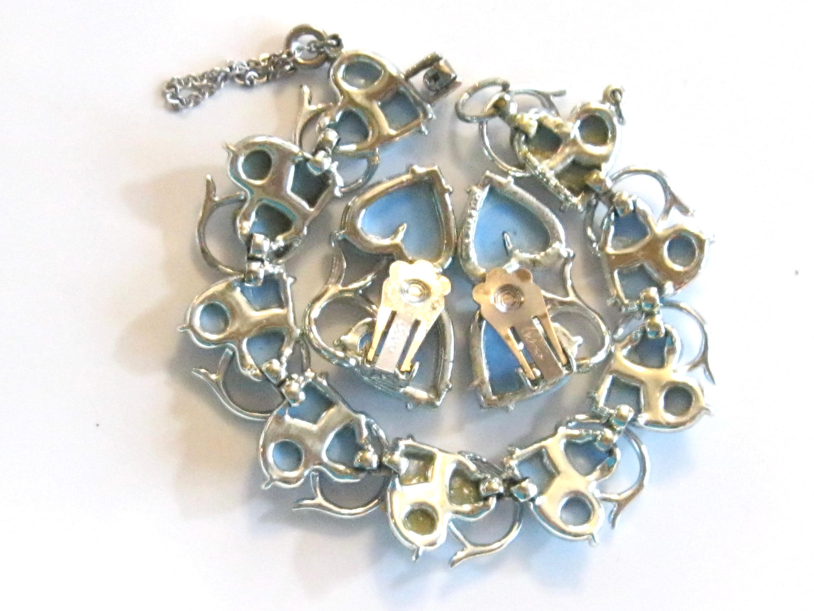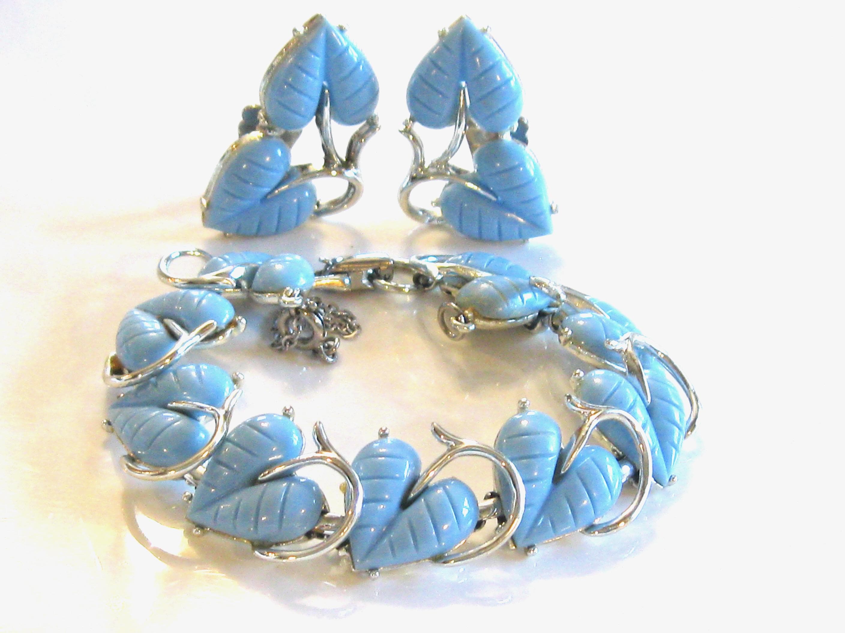 JUST FOR FUN - AI DESCRIPTION: This vintage Coro jewelry set from the 1950s features a blue thermoset heart or leaf bracelet with clip earrings in a silver toned setting. Signed by the brand, this retro set is a perfect addition to any woman's jewelry collection. Made of blue plastic, this set captures the style and elegance of the mid-century era with its unique design and vibrant color. Ideal for those who appreciate vintage and antique jewelry, this set is a timeless piece that exudes charm and sophistication.