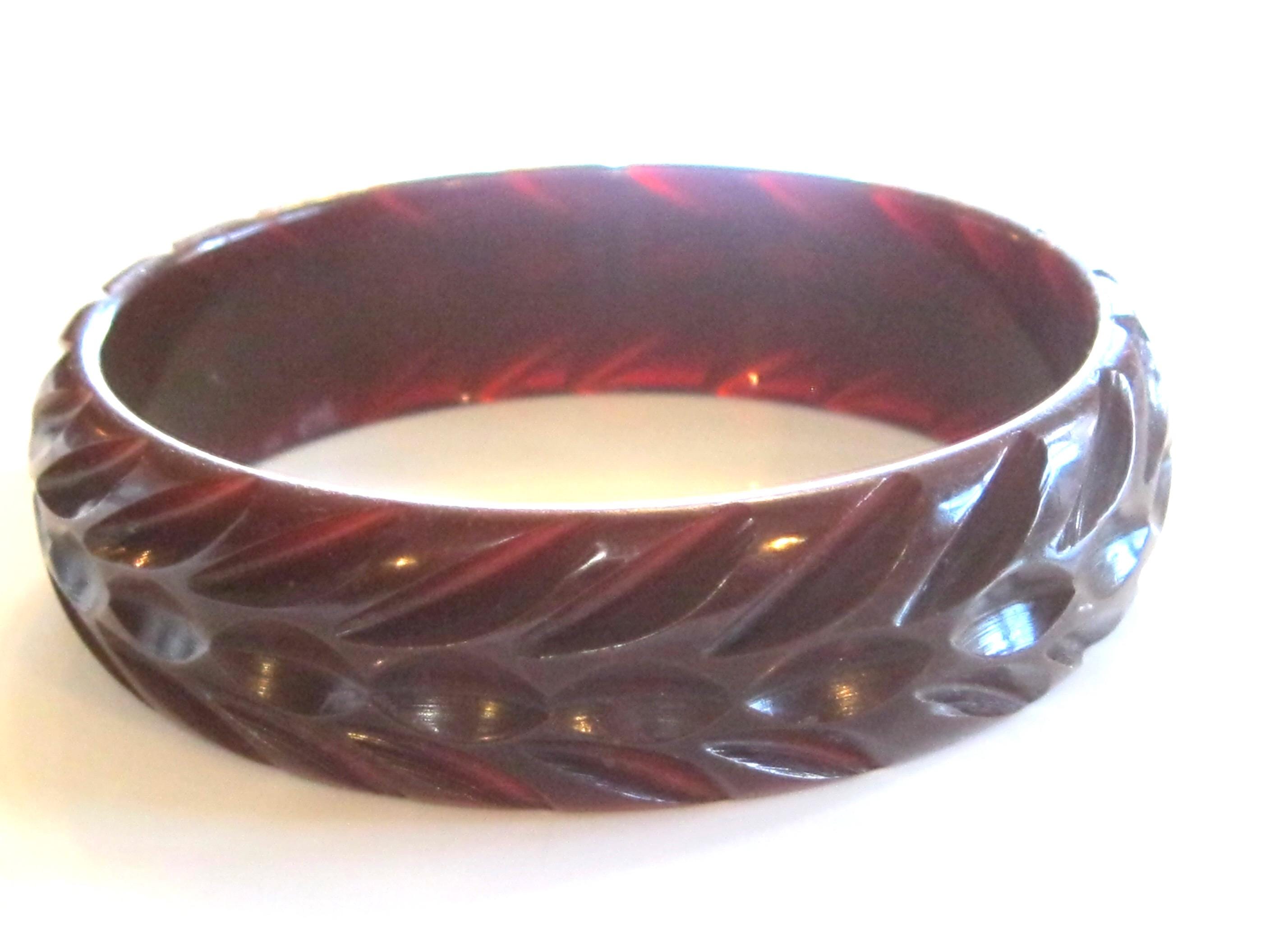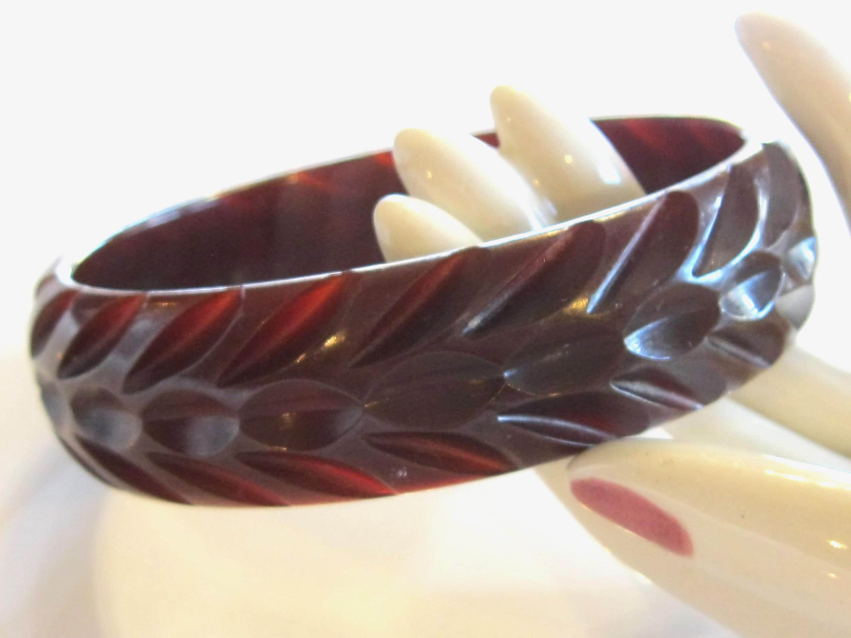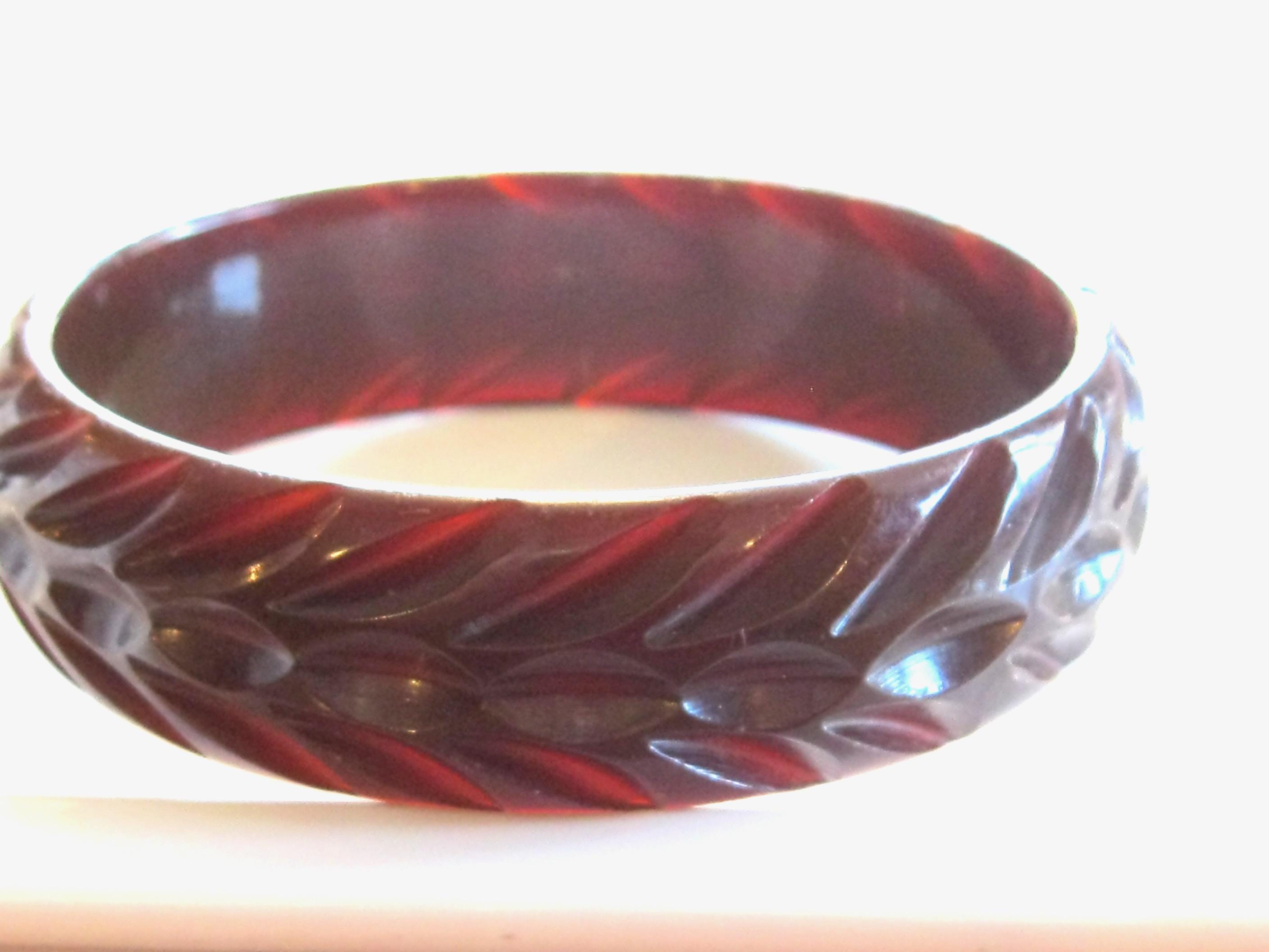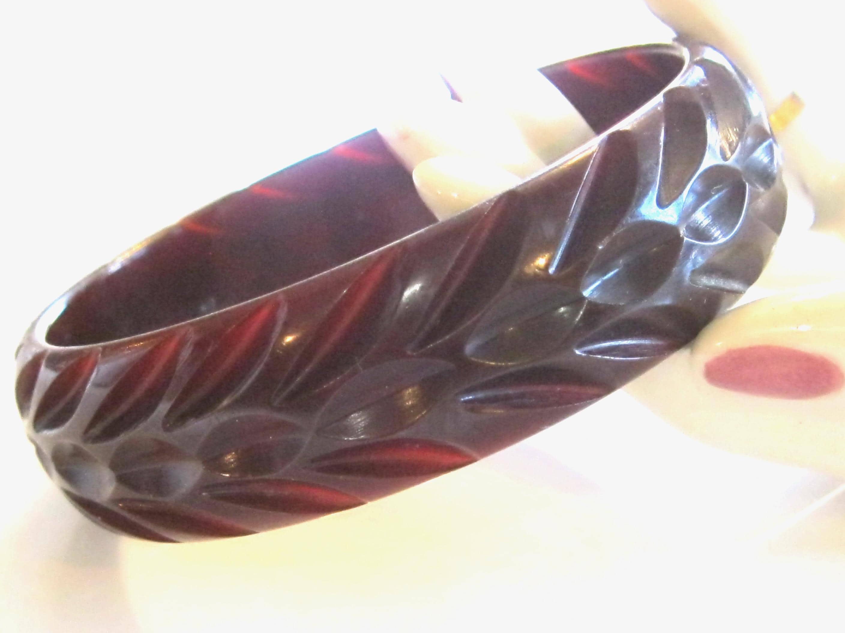 Vintage / antique art deco carved bakelite dark cherry amber bangle bracelet: