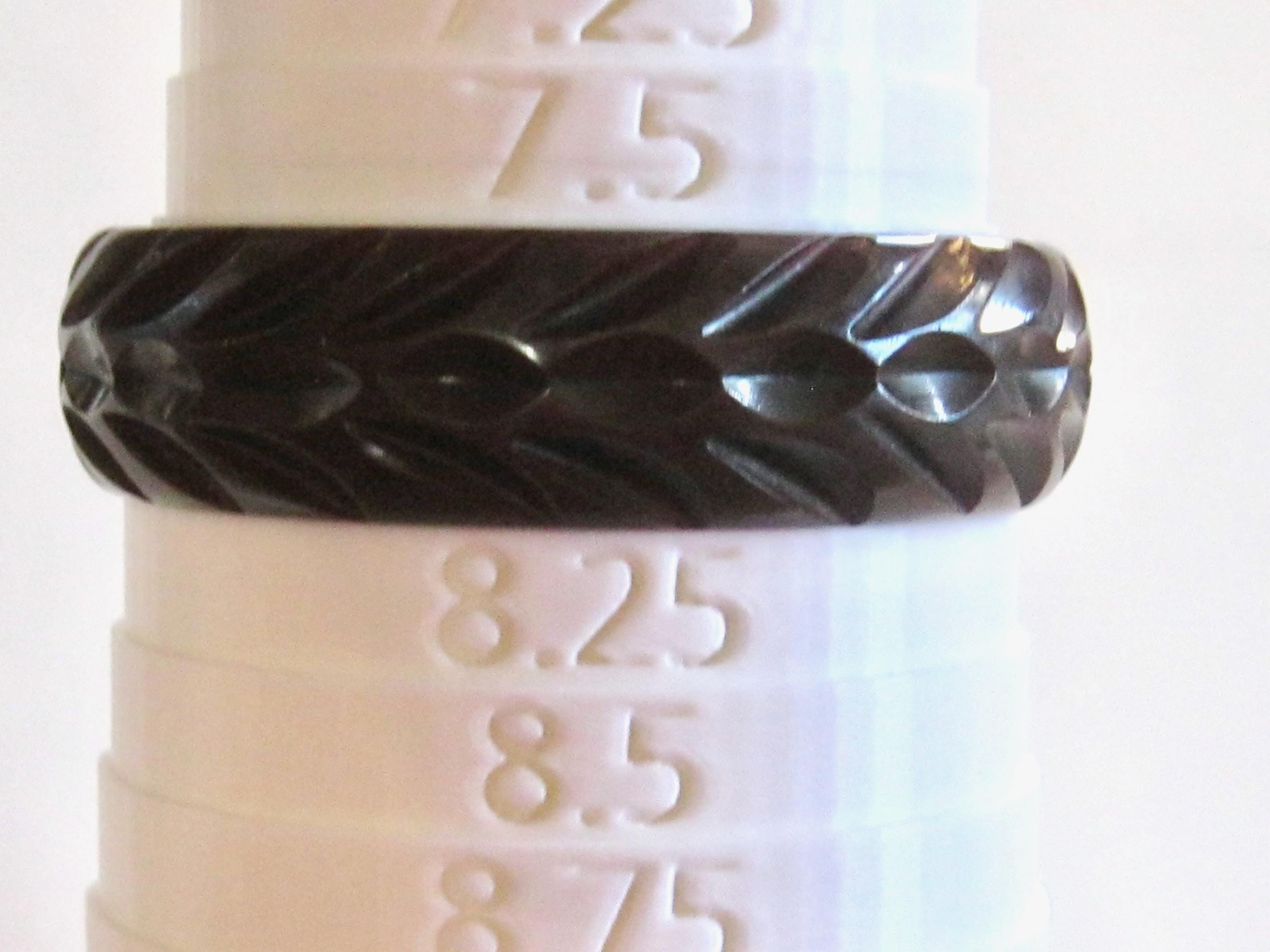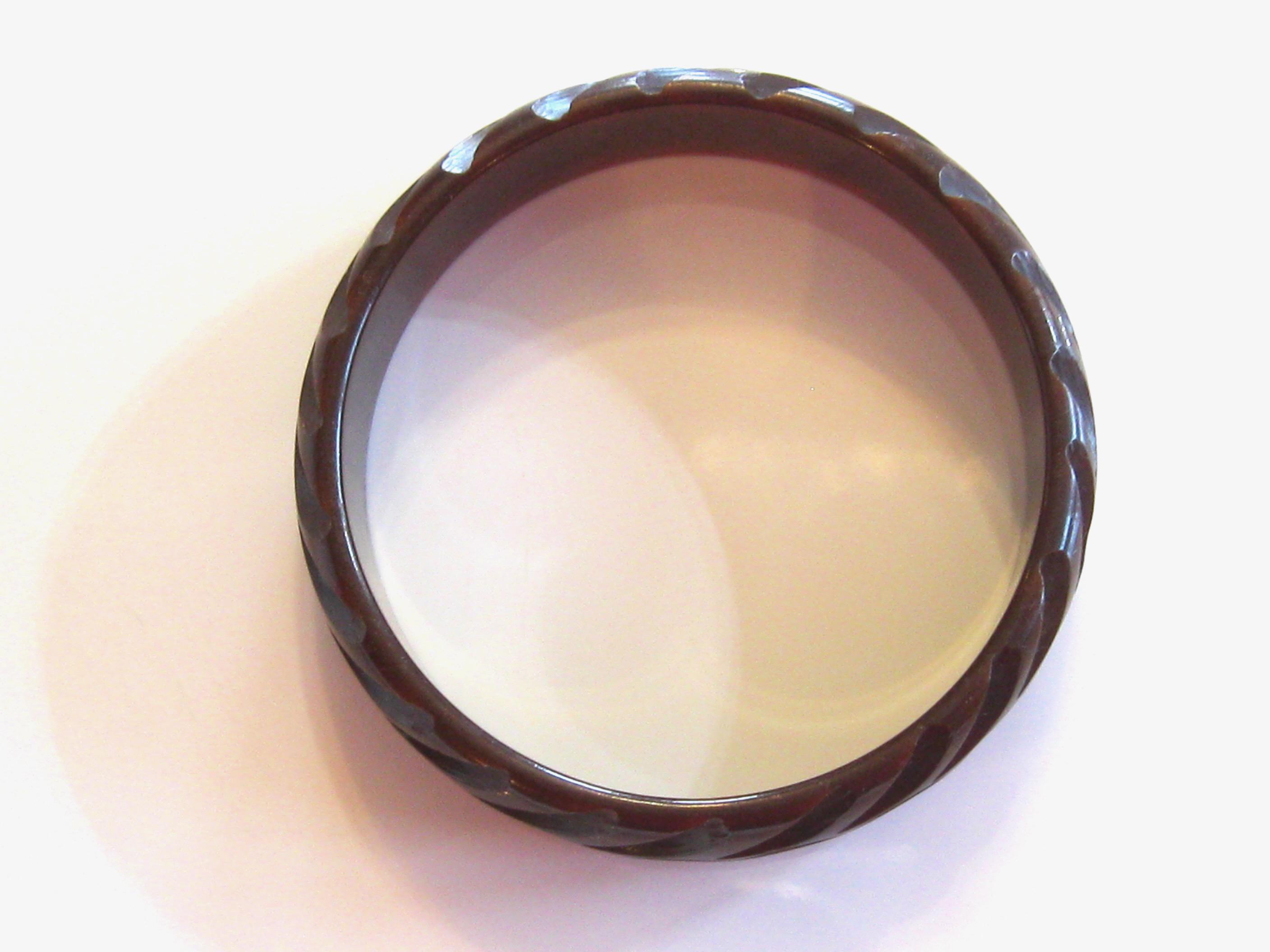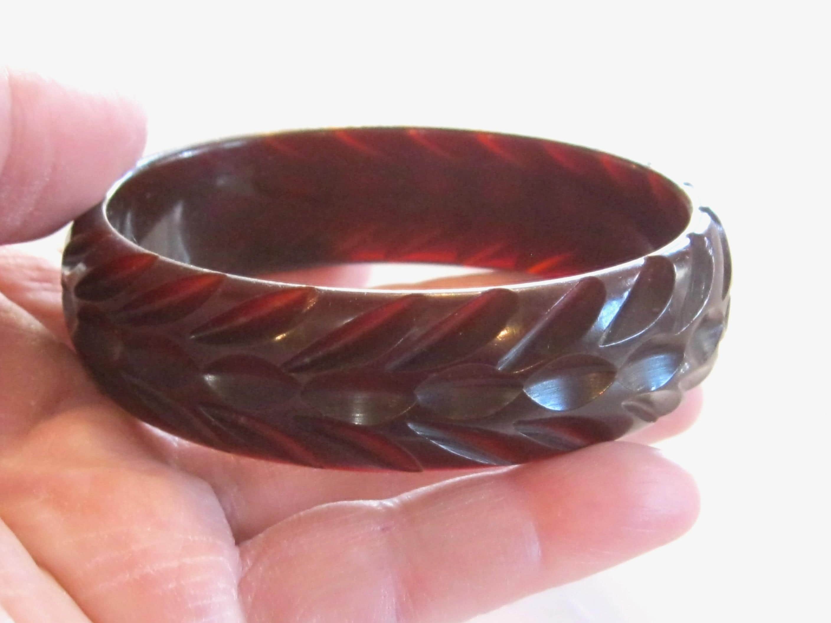 INTERESTING INFORMATION: Bakelite bangles are highly collectible due to their scarcity, vibrant Art Deco styling, and the fact that they are made from a unique and durable material. Widely known to be one the first synthetic plastics (invented in 1907 and production for jewelry purposes largely stopped in the 1940's), Bakelite jewelry pieces enjoyed wide spread popularity but also a very short production run. They offered a bold modern look, came many color choices, and were well made and sturdy. Designers with a keen eye and sense of style, like Coco Chanel, knew early on these pieces should be seen as wearable art and staples of any smart costume jewelry wardrobe. This bangle is extra special as it ranks very high for rareness and collectibility, having several desirable characteristics like the striking color tones and carved pattern