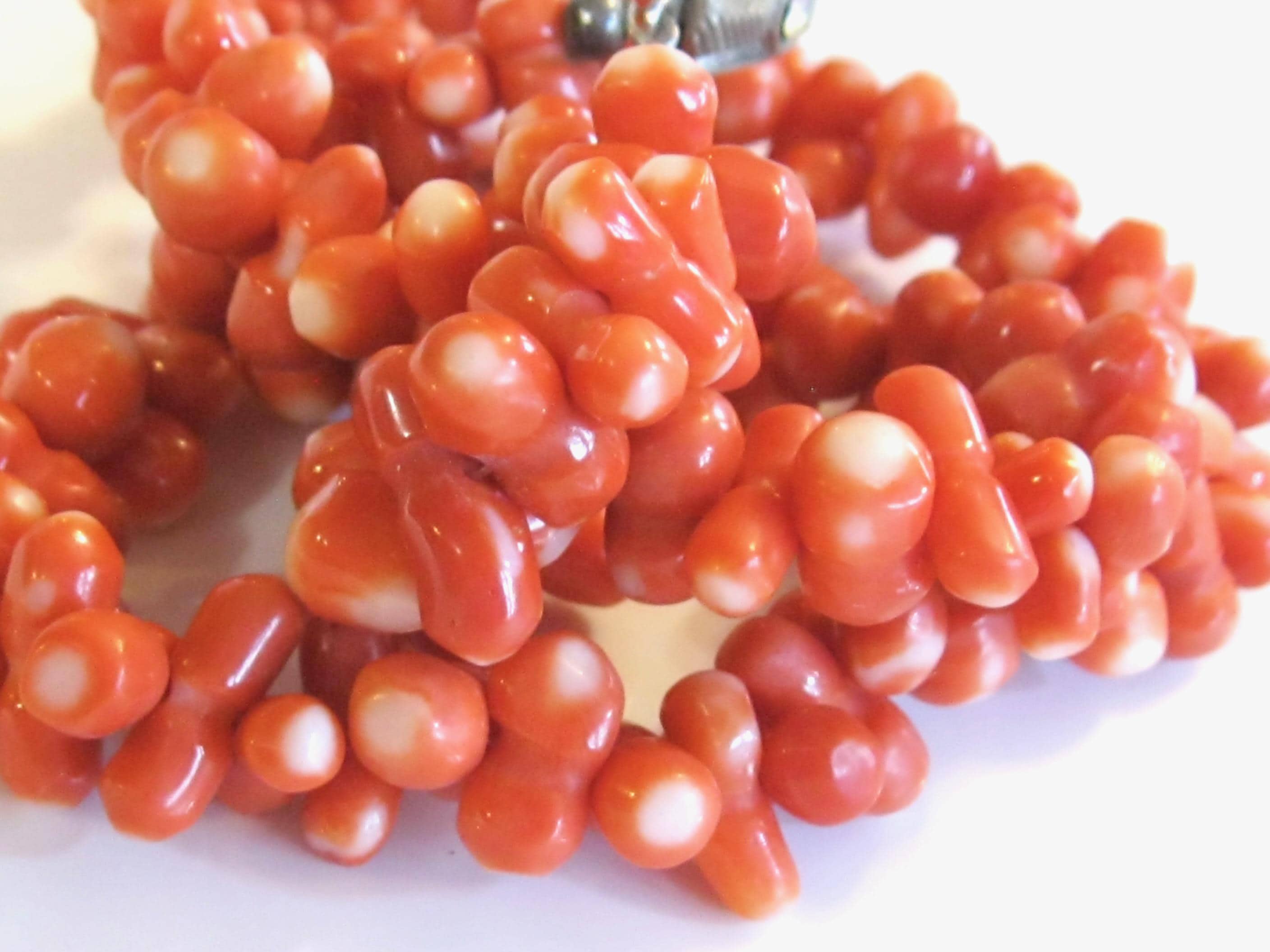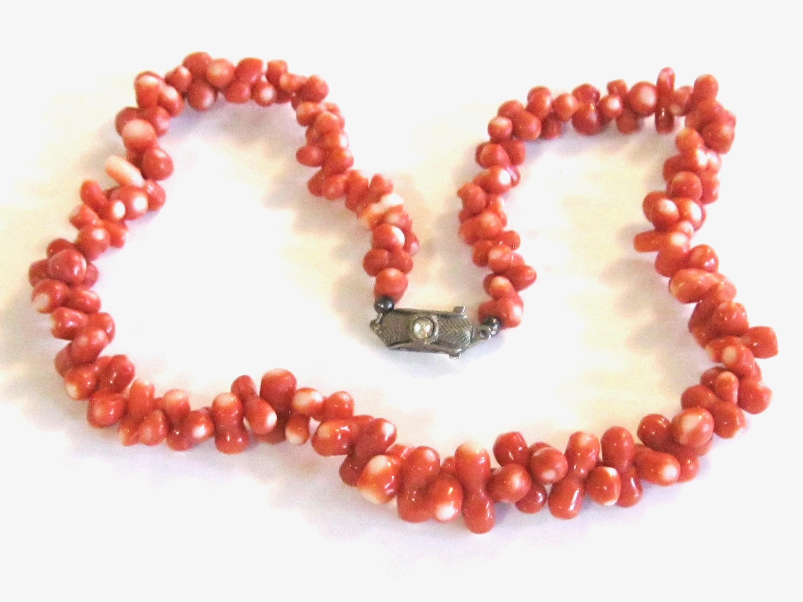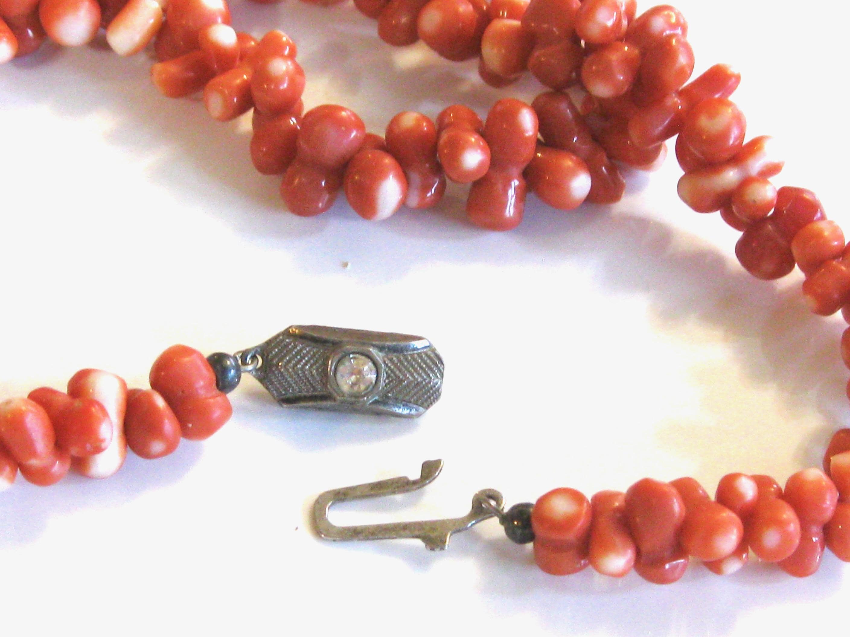 JUST FOR FUN - AI DESCRIPTION: This product is a rare vintage Japanese Momo Coral hand-carved necklace with salmon-colored beads. The necklace features dumbbell-shaped hand-carved bead with a unique salmon and white color scheme. It is made of natural coral material with an 800 silver clasp, and has a length of 18 inches. This statement piece is perfect for various occasions like Christmas, birthdays, weddings, or even everyday wear. Its unique and sophisticated design makes it a highly collectible item, ideal for those who appreciate antique and retro jewelry.