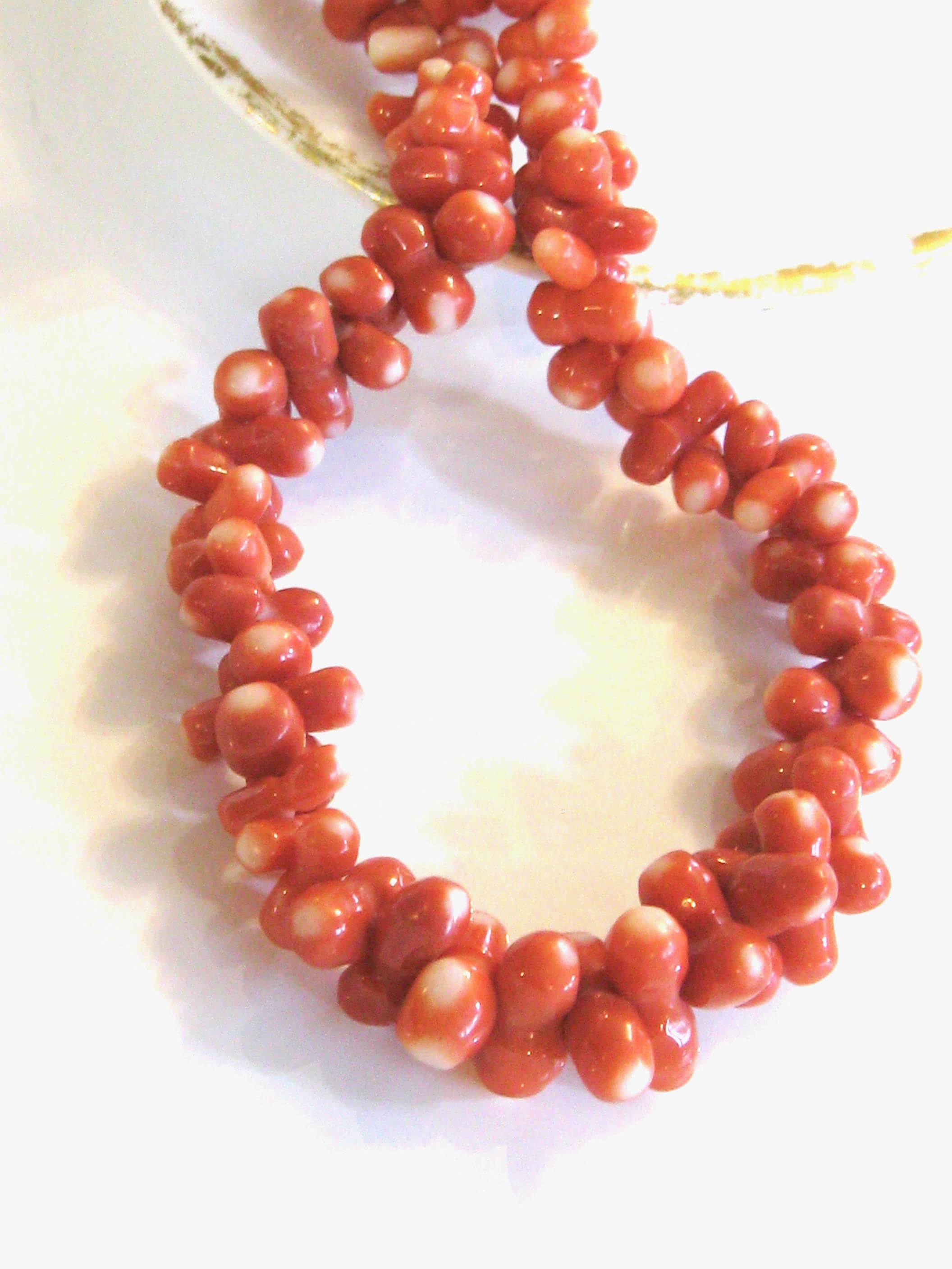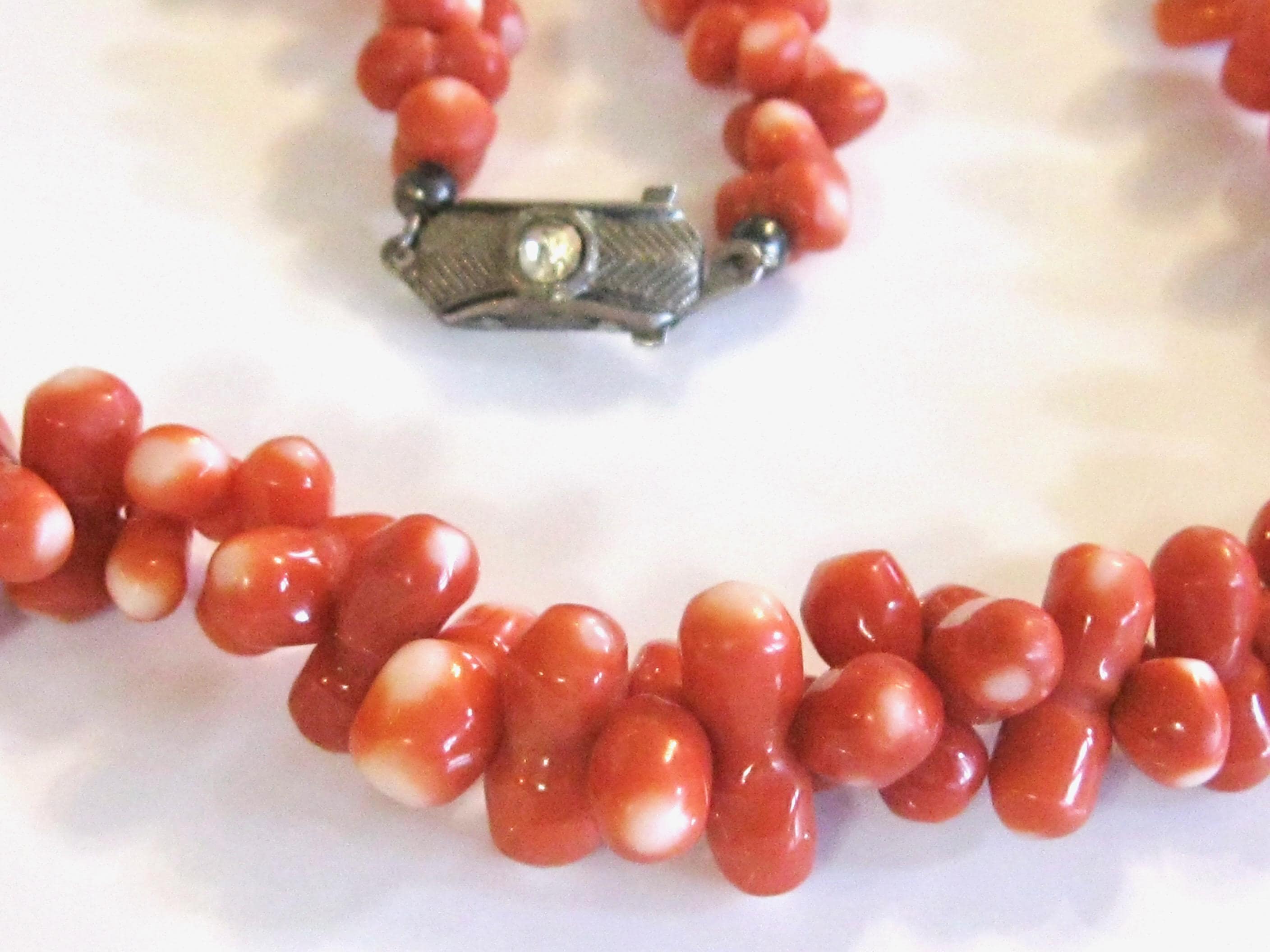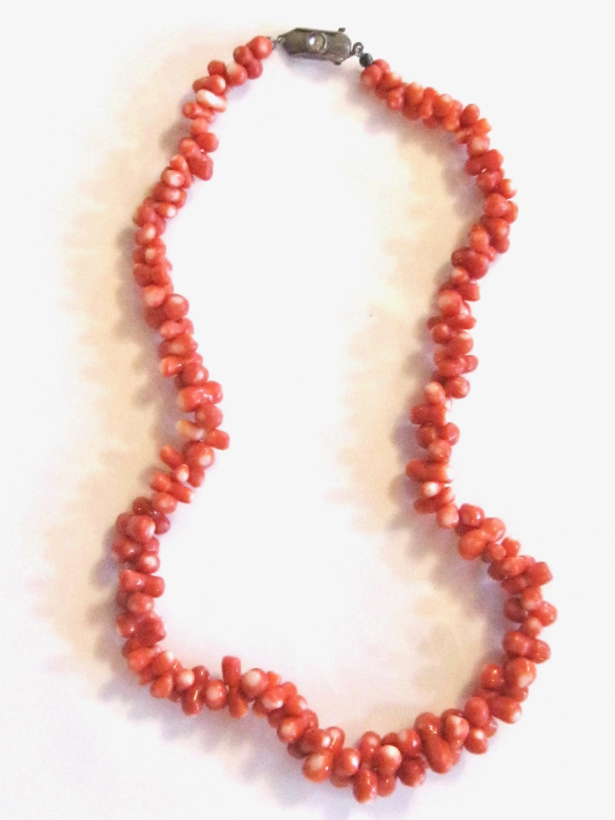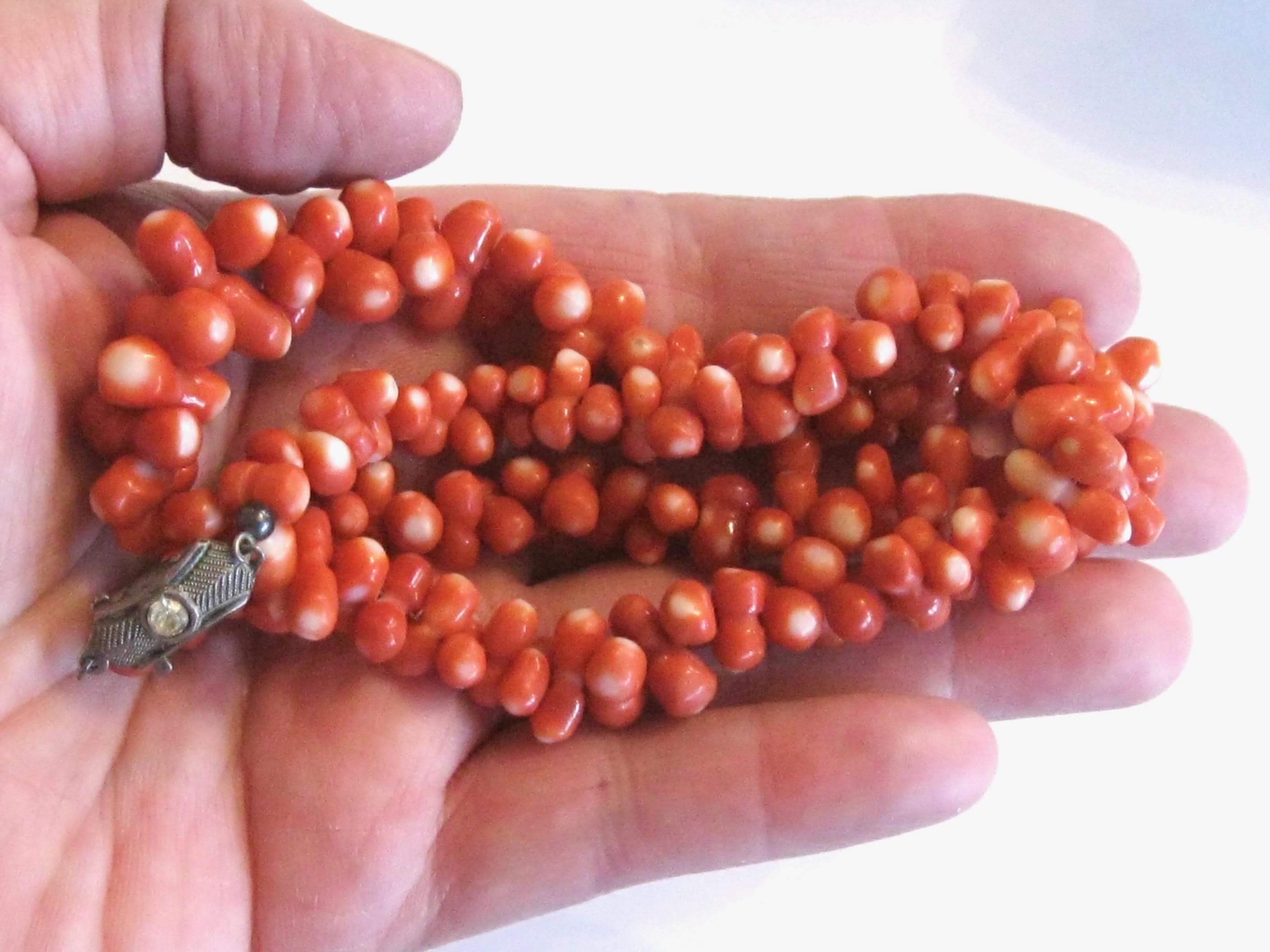 JUST FOR FUN - AI DESCRIPTION: This product is a rare vintage Japanese Momo Coral hand-carved necklace with salmon-colored beads. The necklace features dumbbell-shaped hand-carved bead with a unique salmon and white color scheme. It is made of natural coral material with an 800 silver clasp, and has a length of 18 inches. This statement piece is perfect for various occasions like Christmas, birthdays, weddings, or even everyday wear. Its unique and sophisticated design makes it a highly collectible item, ideal for those who appreciate antique and retro jewelry.